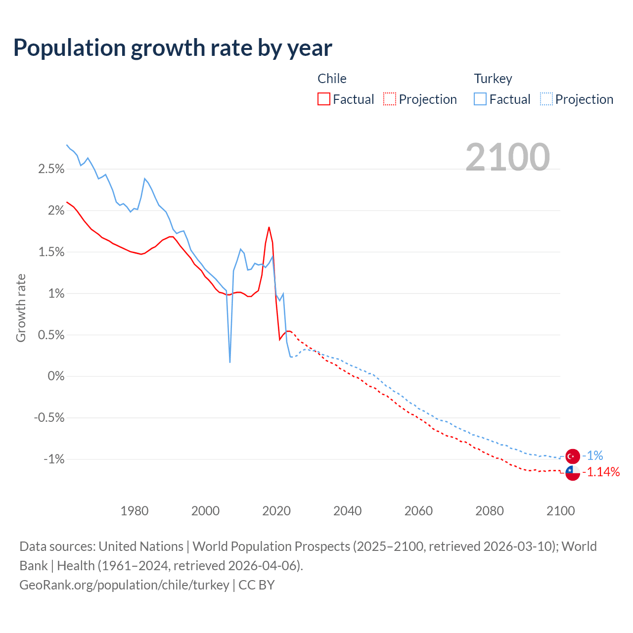 - For the last 10 years, Chile has had an average growth rate of +1.02% per year vs +1.06% in Turkey.