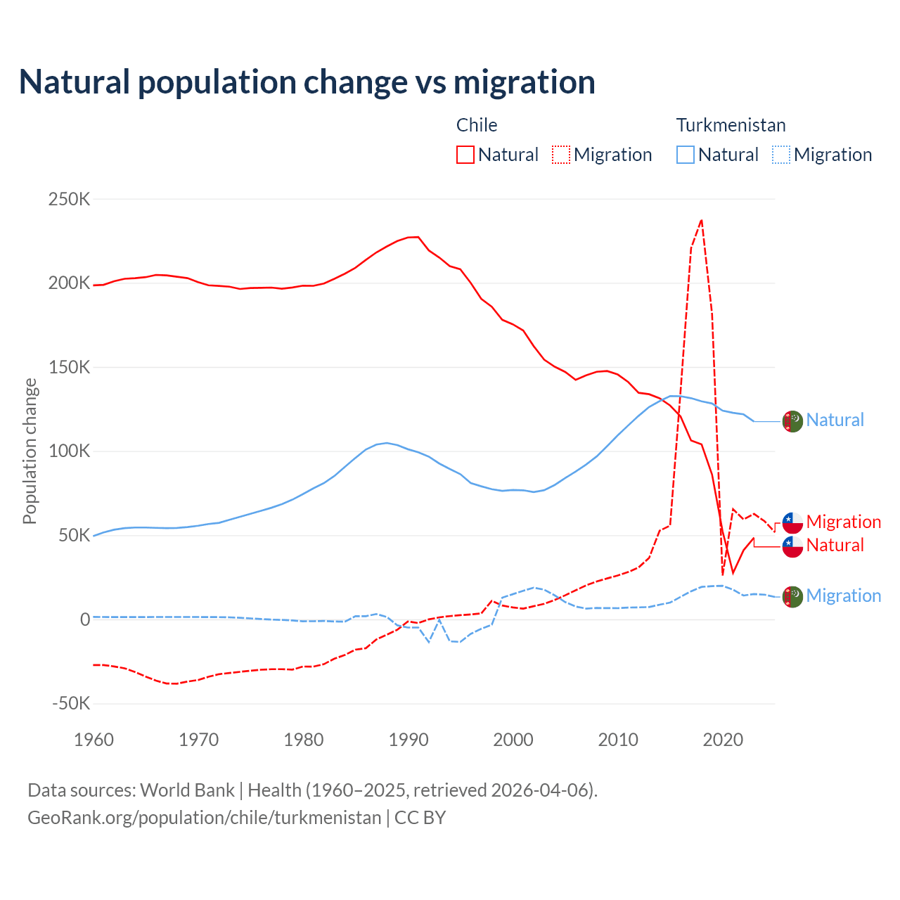 Over the last 10 years, 43.5% of the population change in Chile is from natural causes (a gain of 844,683 people) and 56.5% is from migration (a gain of 1,097,597 people). In Turkmenistan 89.2% is from natural causes (a gain of 1,270,228 people) and 10.8% is from migration (a gain of 154,379 people).