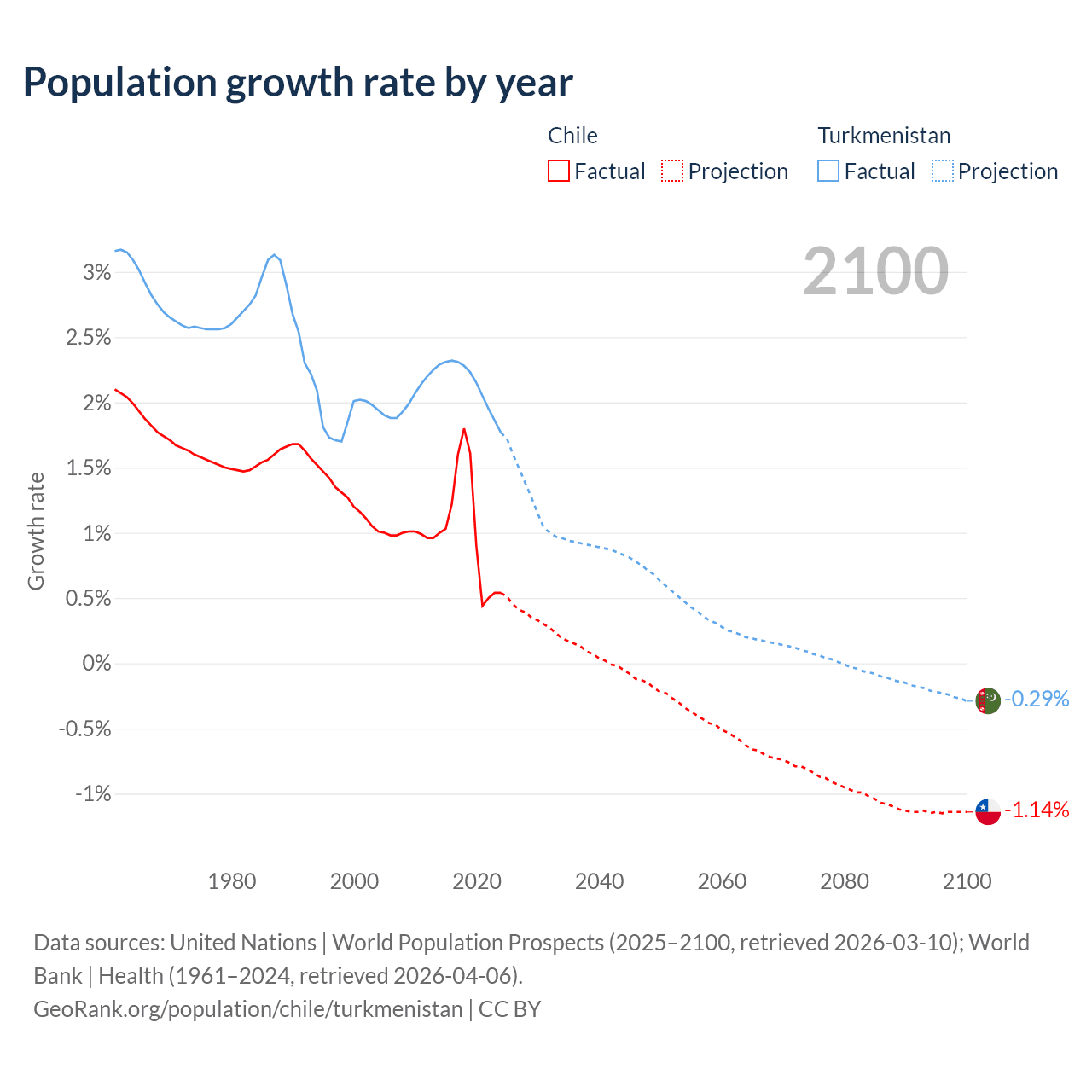 - For the last 10 years, Chile has had an average growth rate of +1.02% per year vs +2.14% in Turkmenistan.