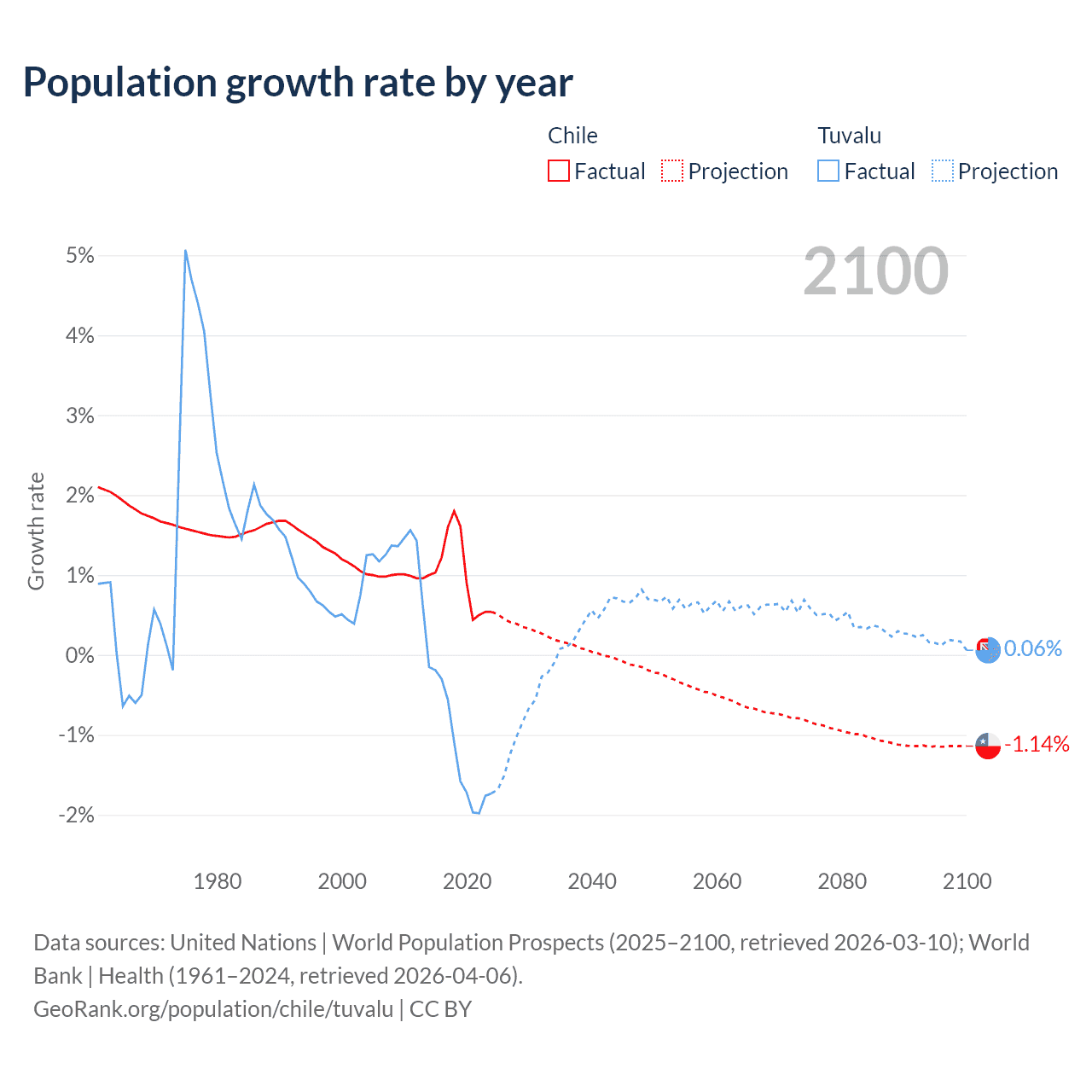 - For the last 10 years, Chile has had an average growth rate of +1.02% per year vs -1.19% in Tuvalu.