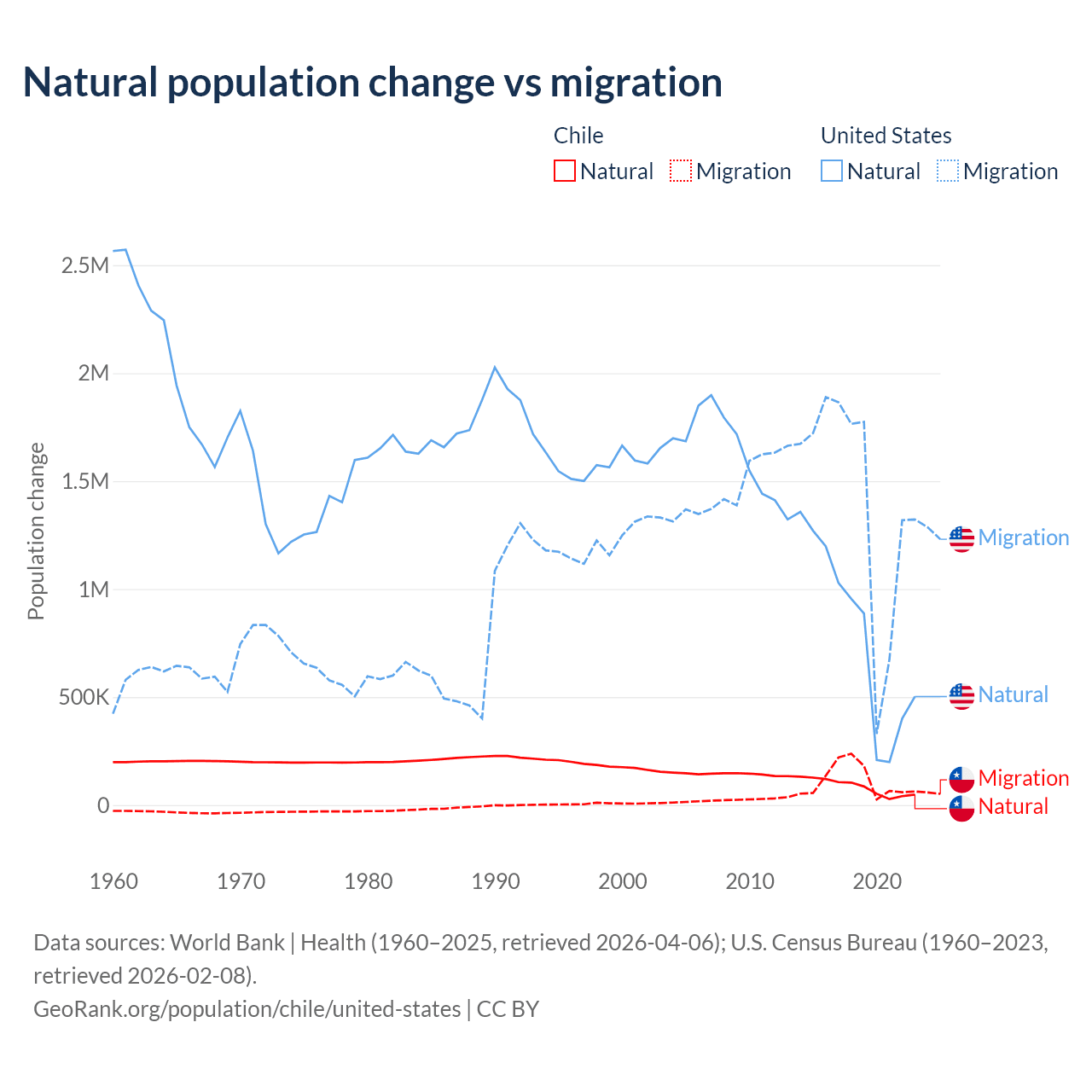 Over the last 10 years, 43.5% of the population change in Chile is from natural causes (a gain of 844,683 people) and 56.5% is from migration (a gain of 1,097,597 people). In the United States 35.8% is from natural causes (a gain of 8,005,866 people) and 64.2% is from migration (a gain of 14,334,286 people).
