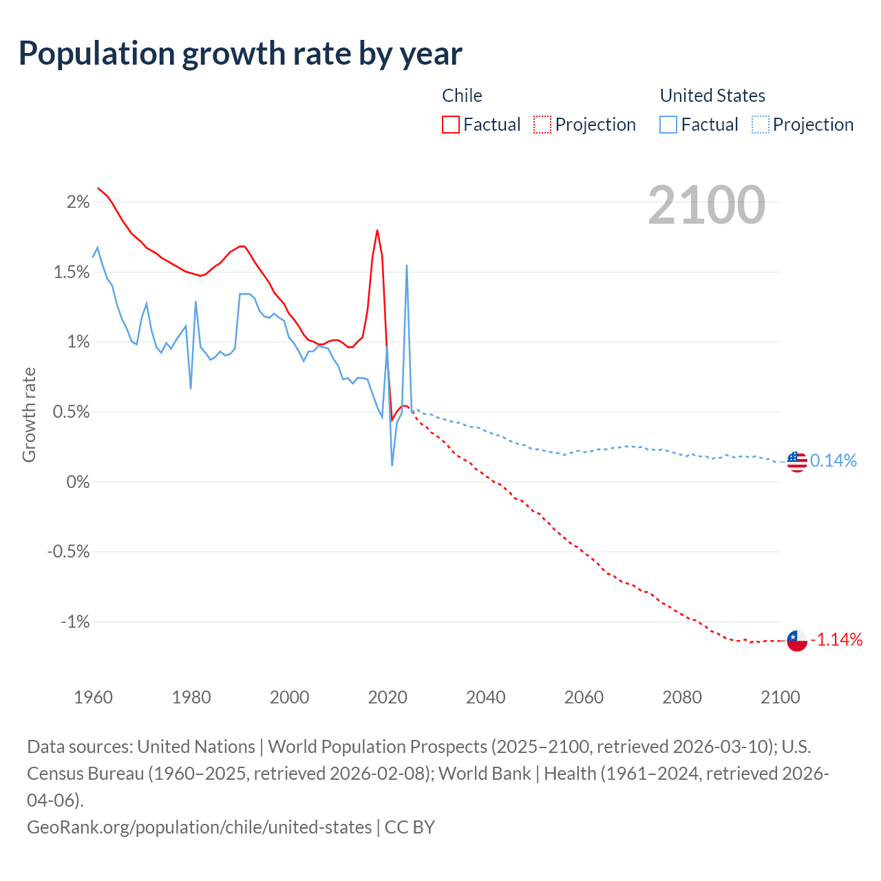 - For the last 10 years, Chile has had an average growth rate of +1.02% per year vs +0.65% in the United States.