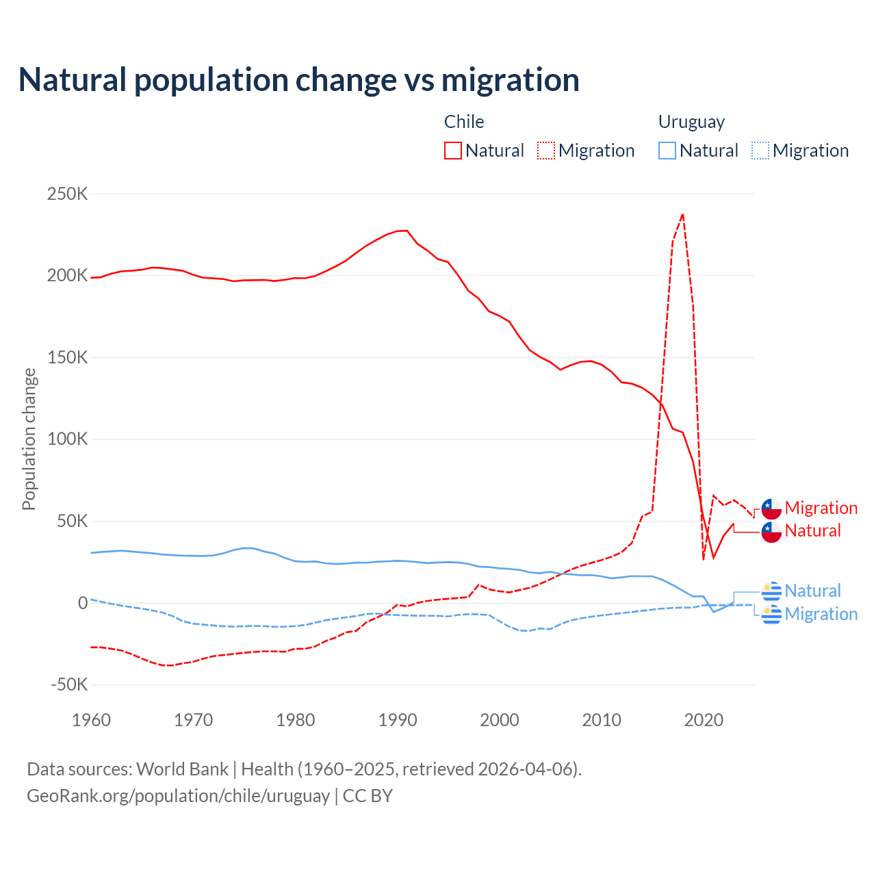 Over the last 10 years, 43.5% of the population change in Chile is from natural causes (a gain of 844,683 people) and 56.5% is from migration (a gain of 1,097,597 people). In Uruguay 70% is from natural causes (a gain of 64,303 people) and 30% is from migration (a loss of 27,501 people).