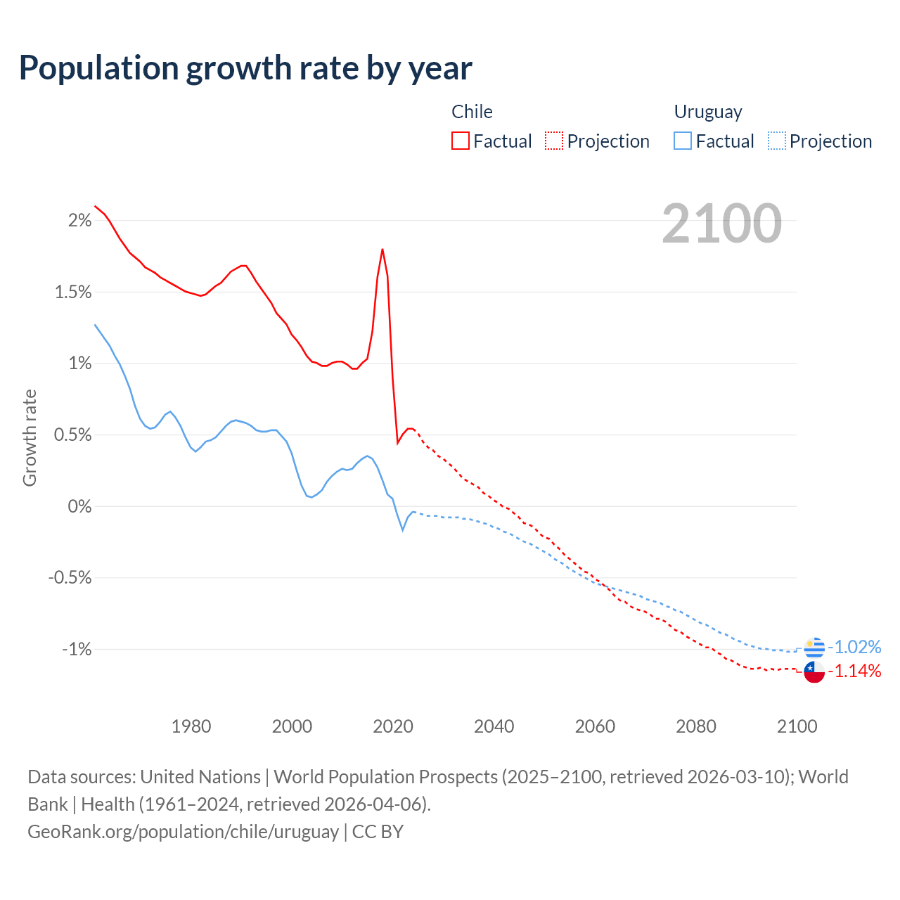 - For the last 10 years, Chile has had an average growth rate of +1.02% per year vs +0.11% in Uruguay.