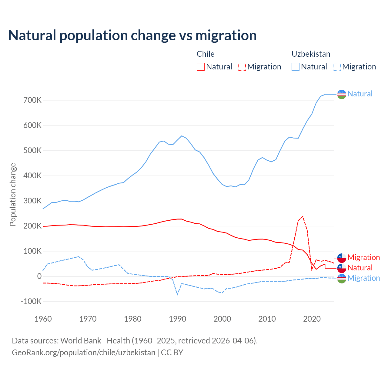 Over the last 10 years, 43.5% of the population change in Chile is from natural causes (a gain of 844,683 people) and 56.5% is from migration (a gain of 1,097,597 people). In Uzbekistan 98.2% is from natural causes (a gain of 6,161,117 people) and 1.84% is from migration (a loss of 115,398 people).