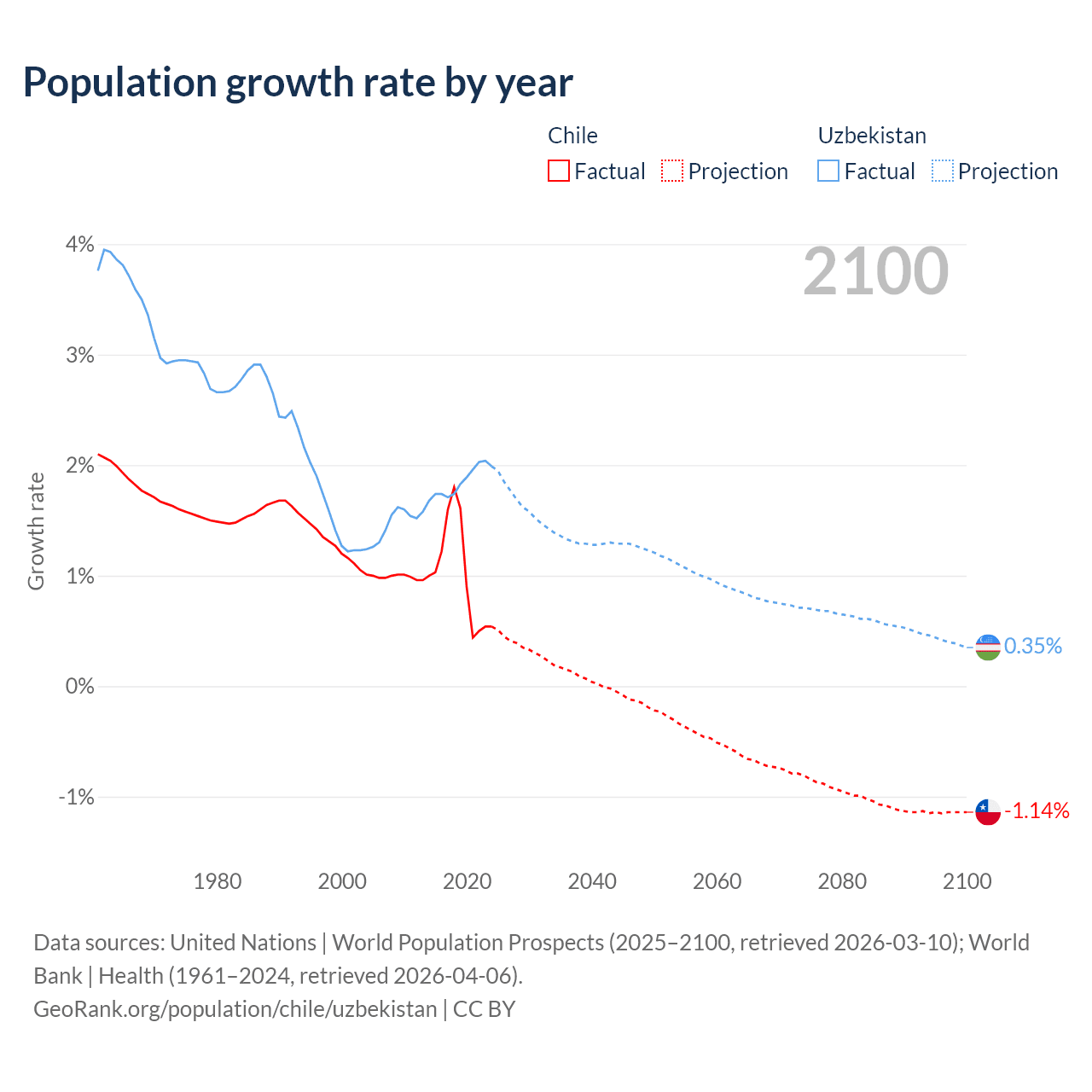 - For the last 10 years, Chile has had an average growth rate of +1.02% per year vs +1.85% in Uzbekistan.