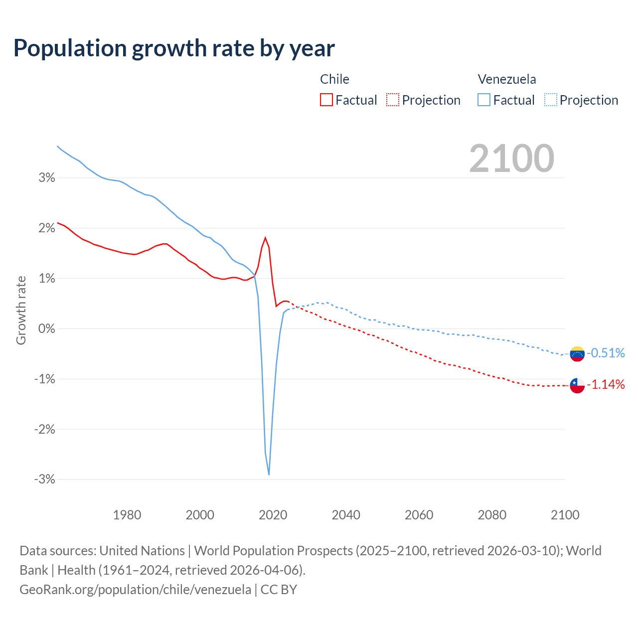 - For the last 10 years, Chile has had an average growth rate of +1.02% per year vs -0.46% in Venezuela.