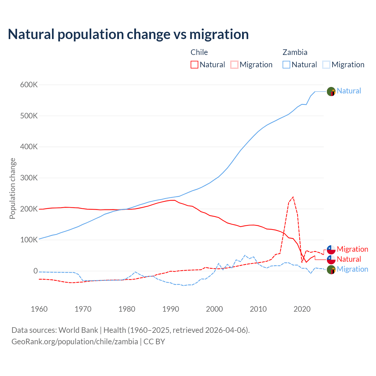Over the last 10 years, 43.5% of the population change in Chile is from natural causes (a gain of 844,683 people) and 56.5% is from migration (a gain of 1,097,597 people). In Zambia 97.4% is from natural causes (a gain of 5,233,797 people) and 2.58% is from migration (a gain of 138,554 people).