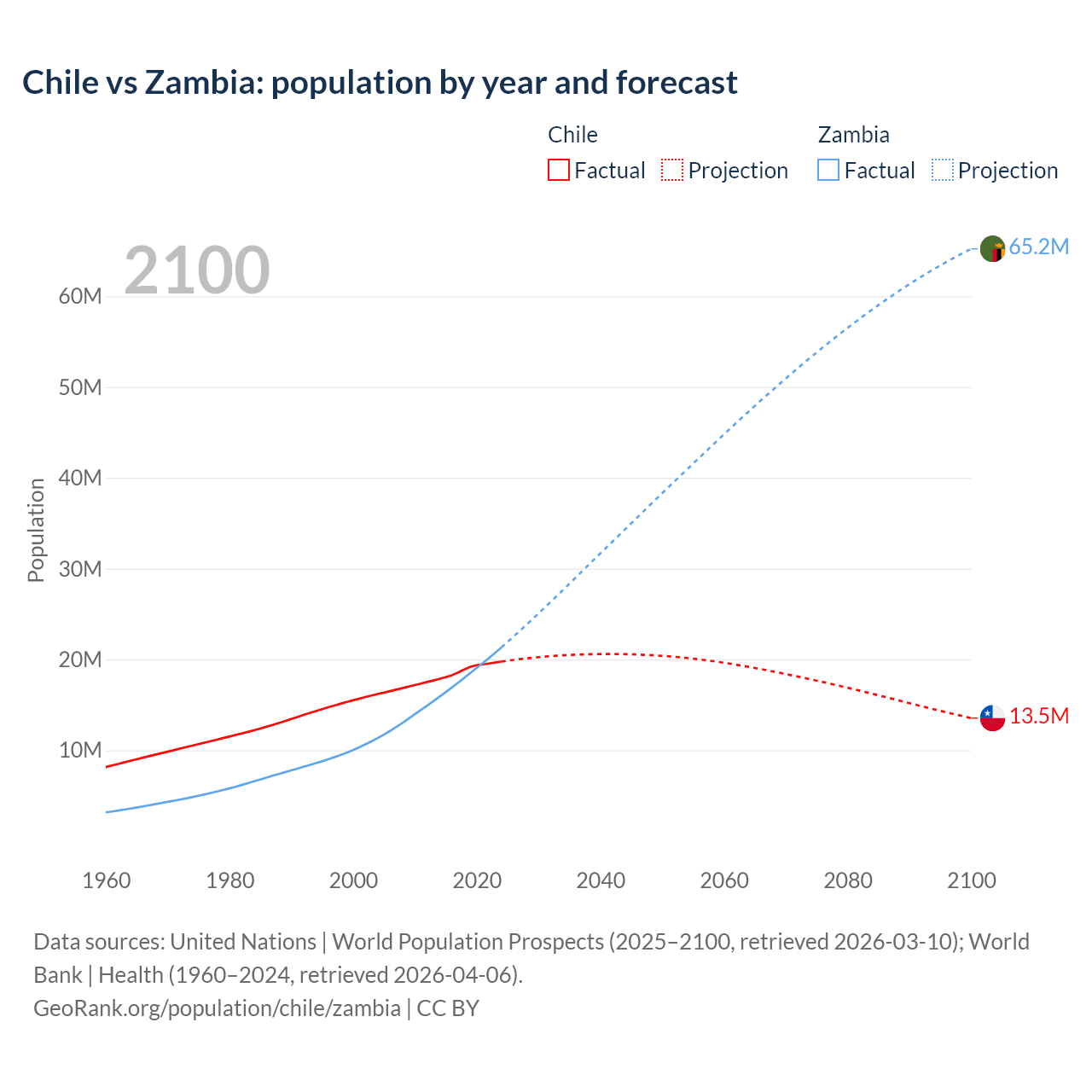 The latest officially reported population of Chile was 19,764,771 in 2024 vs 21,314,956 people in Zambia in 2024. In 2026, based on the adjusted UN estimation, the current Chile's population is 19,977,856 people compared to 22,697,916 in Zambia.