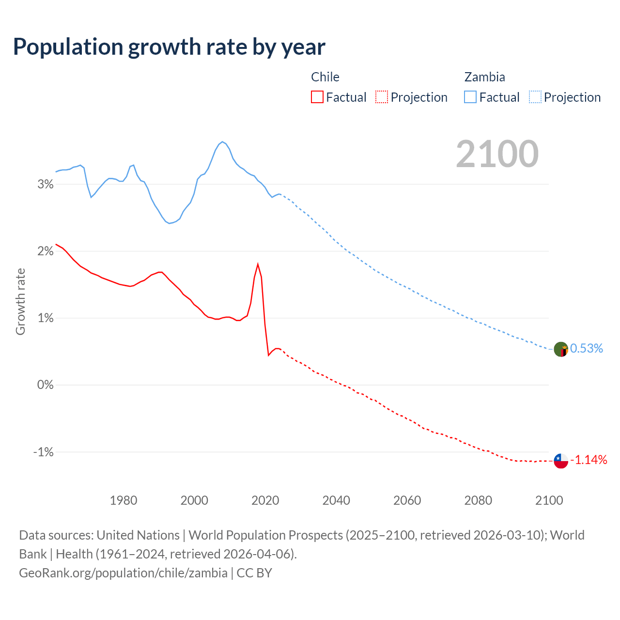 - For the last 10 years, Chile has had an average growth rate of +1.02% per year vs +3% in Zambia.