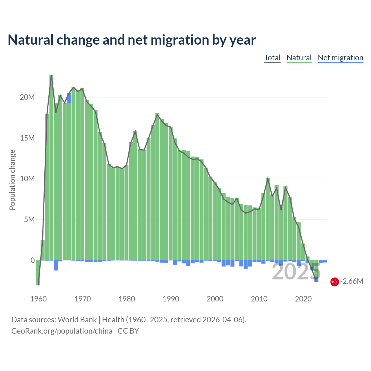 Over the last 10 years, 92.5% of the population change in China is from natural causes (a gain of 42,414,528 people) and 7.53% is from migration (a loss of 3,452,923 people).