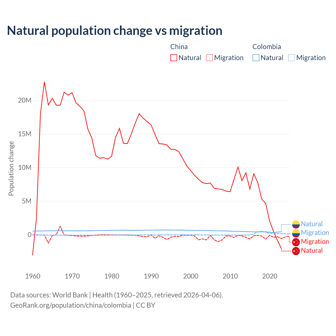 Over the last 10 years, 92.5% of the population change in China is from natural causes (a gain of 42,414,528 people) and 7.53% is from migration (a loss of 3,452,923 people). In Colombia 66.6% is from natural causes (a gain of 4,162,856 people) and 33.4% is from migration (a gain of 2,083,051 people).