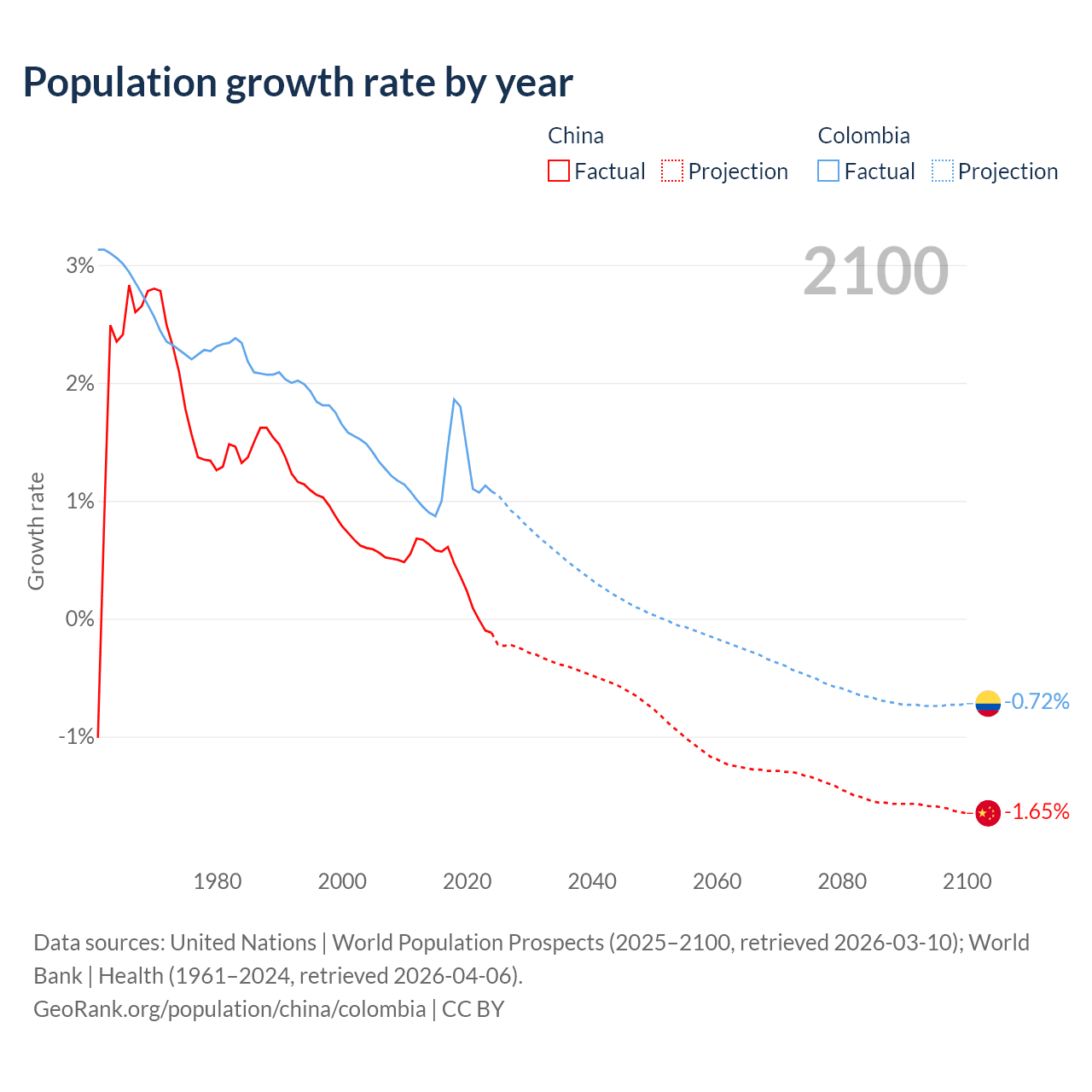 - For the last 10 years, China has had an average growth rate of +0.3% per year vs +1.25% in Colombia.