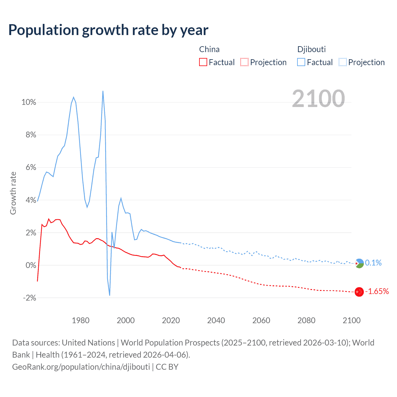 - For the last 10 years, China has had an average growth rate of +0.3% per year vs +1.57% in Djibouti.