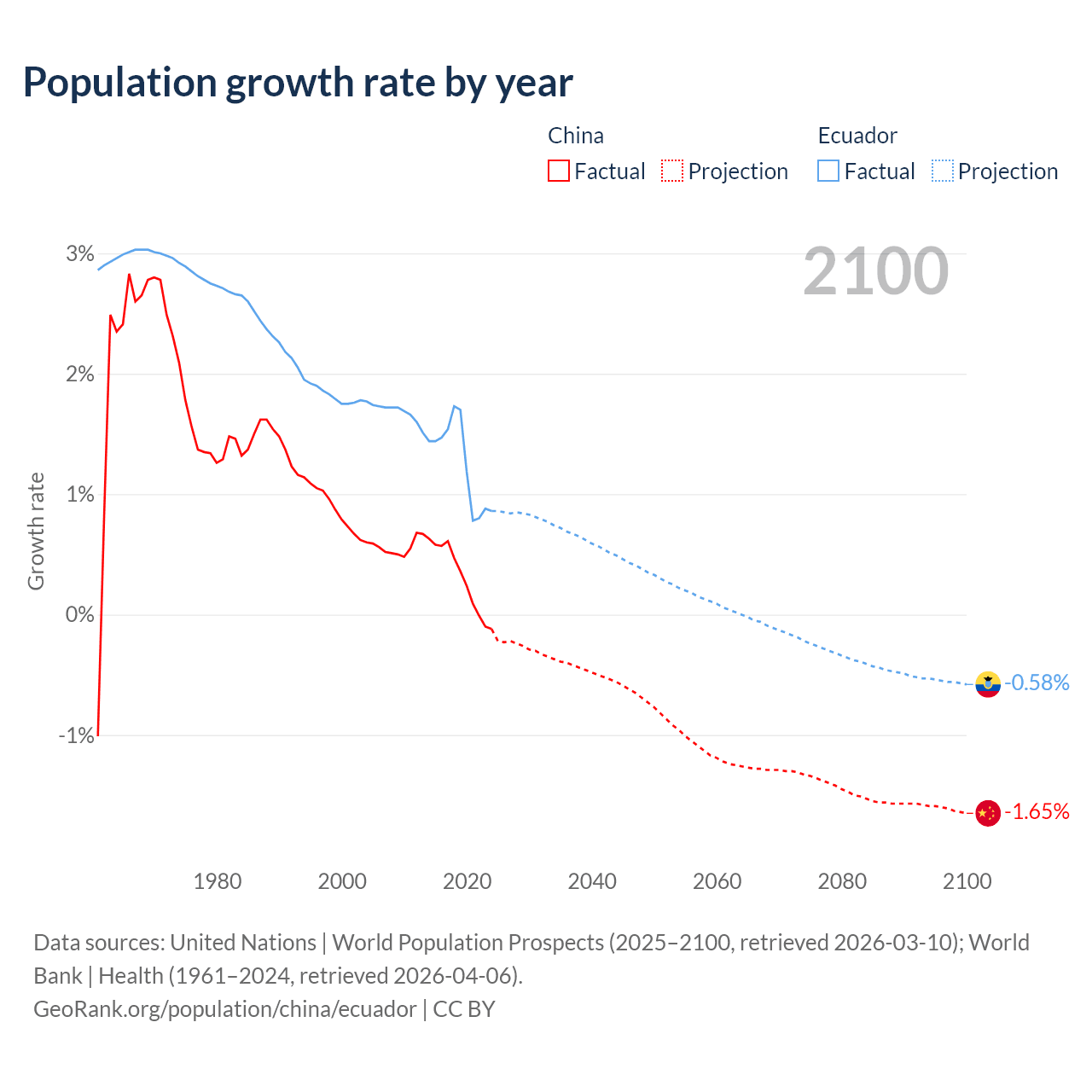 - For the last 10 years, China has had an average growth rate of +0.3% per year vs +1.26% in Ecuador.