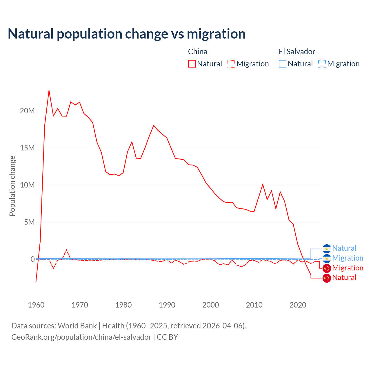 Over the last 10 years, 92.5% of the population change in China is from natural causes (a gain of 42,414,528 people) and 7.53% is from migration (a loss of 3,452,923 people). In El Salvador 58.8% is from natural causes (a gain of 579,641 people) and 41.2% is from migration (a loss of 406,874 people).