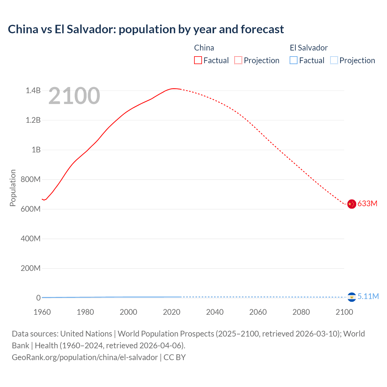 The latest officially reported population of China was 1,408,975,000 in 2024 vs 6,338,193 people in El Salvador in 2024. In 2026, based on the adjusted UN estimation, the current China's population is 1,402,578,808 people compared to 6,399,793 in El Salvador.