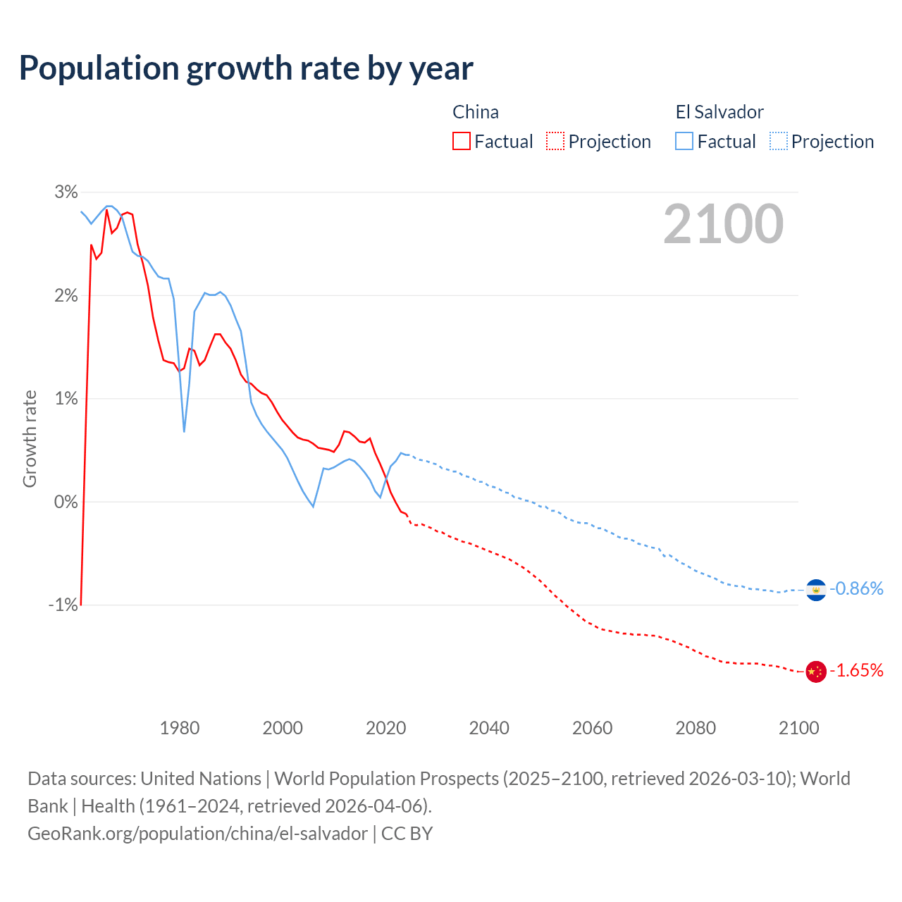 - For the last 10 years, China has had an average growth rate of +0.3% per year vs +0.29% in El Salvador.
