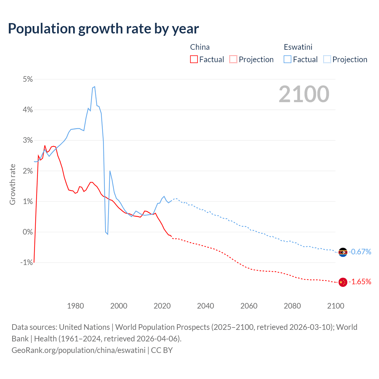 - For the last 10 years, China has had an average growth rate of +0.3% per year vs +0.87% in Eswatini.