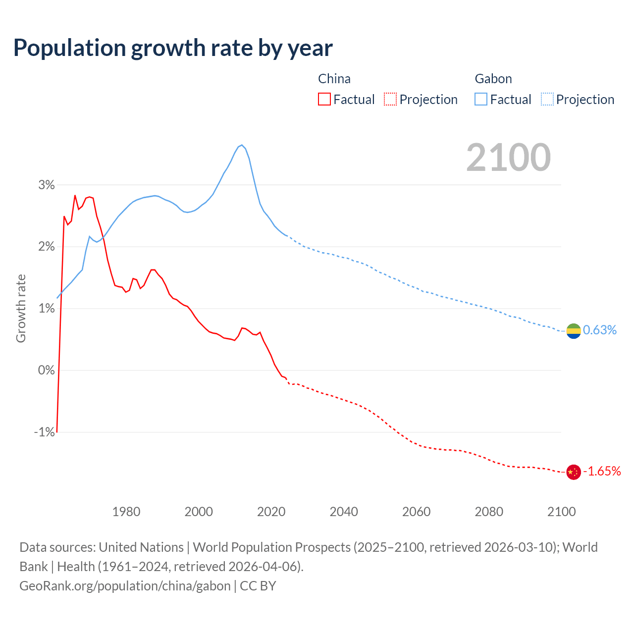 China vs Gabon: population by year and forecast