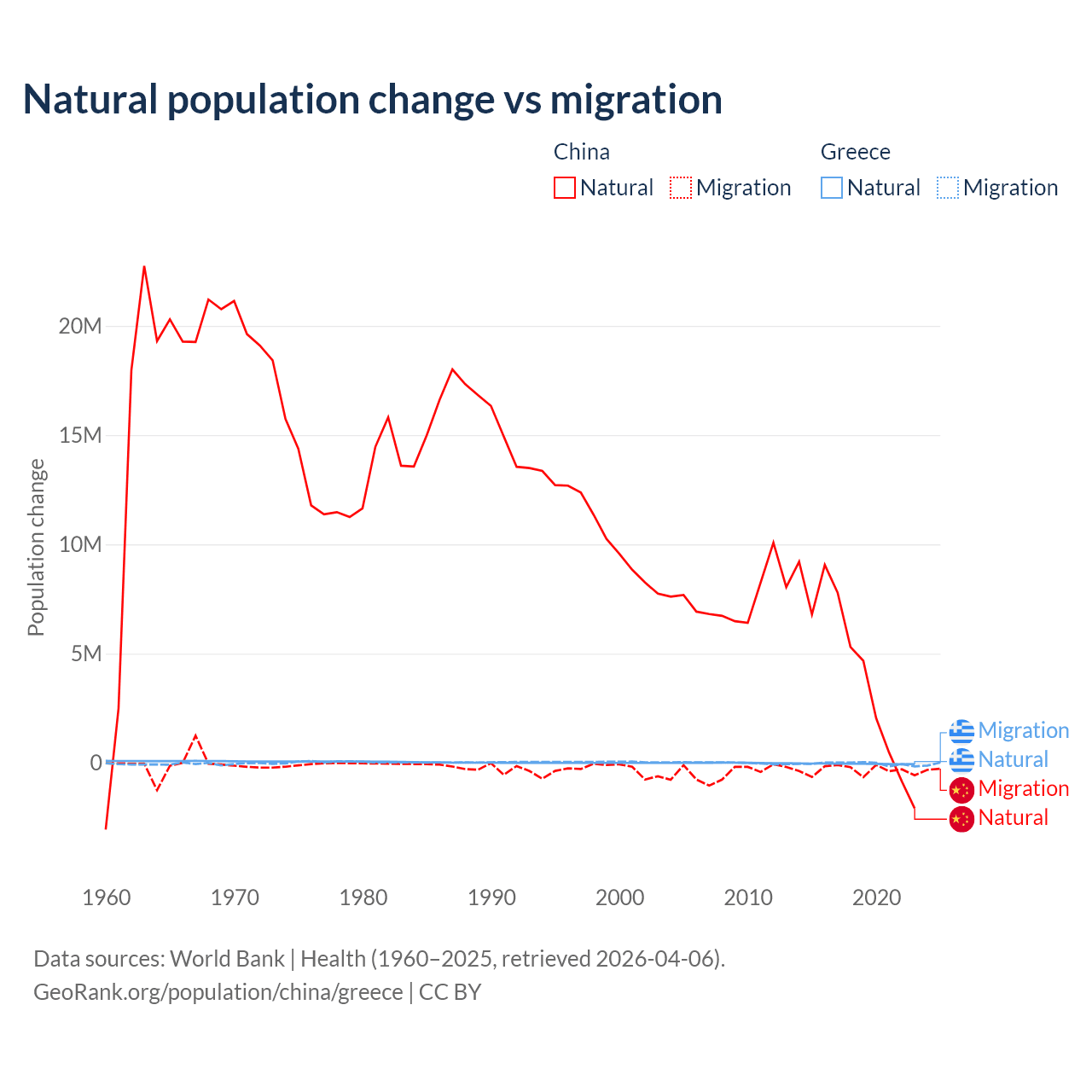 Over the last 10 years, 92.5% of the population change in China is from natural causes (a gain of 42,414,528 people) and 7.53% is from migration (a loss of 3,452,923 people). In Greece 51.9% is from natural causes (a loss of 411,426 people) and 48.1% is from migration (a loss of 381,824 people).