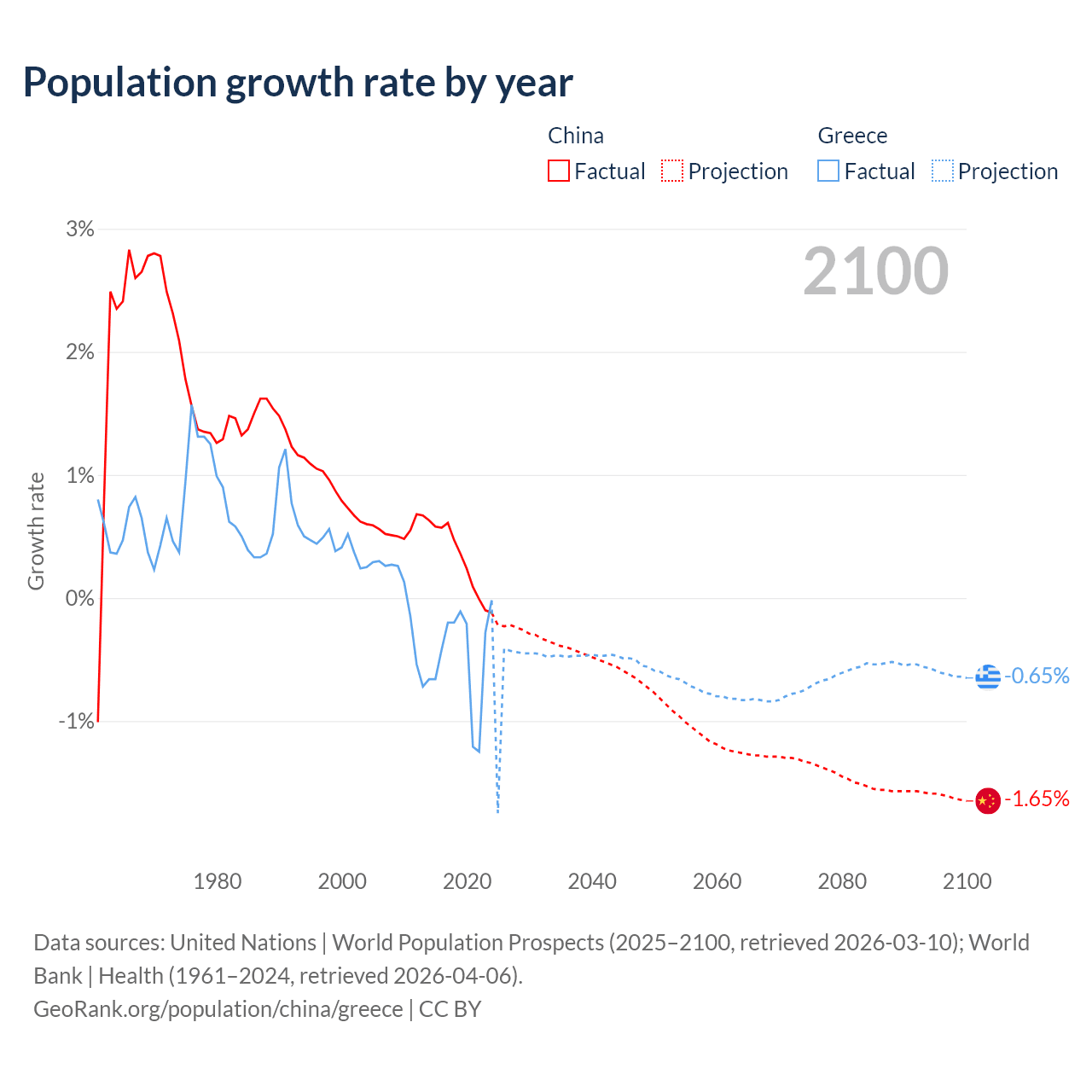 - For the last 10 years, China has had an average growth rate of +0.3% per year vs -0.47% in Greece.
