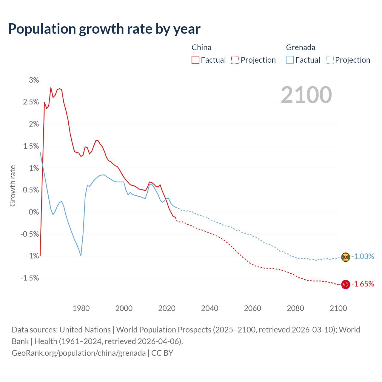 - For the last 10 years, China has had an average growth rate of +0.3% per year vs +0.29% in Grenada.