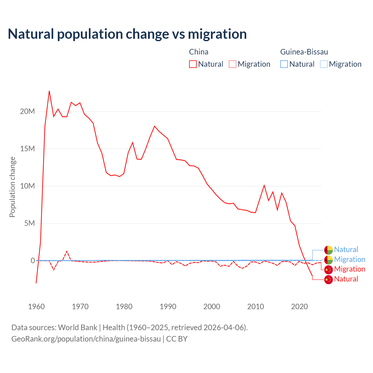 Over the last 10 years, 92.5% of the population change in China is from natural causes (a gain of 42,414,528 people) and 7.53% is from migration (a loss of 3,452,923 people). In Guinea-Bissau 97.1% is from natural causes (a gain of 472,826 people) and 2.87% is from migration (a loss of 13,956 people).