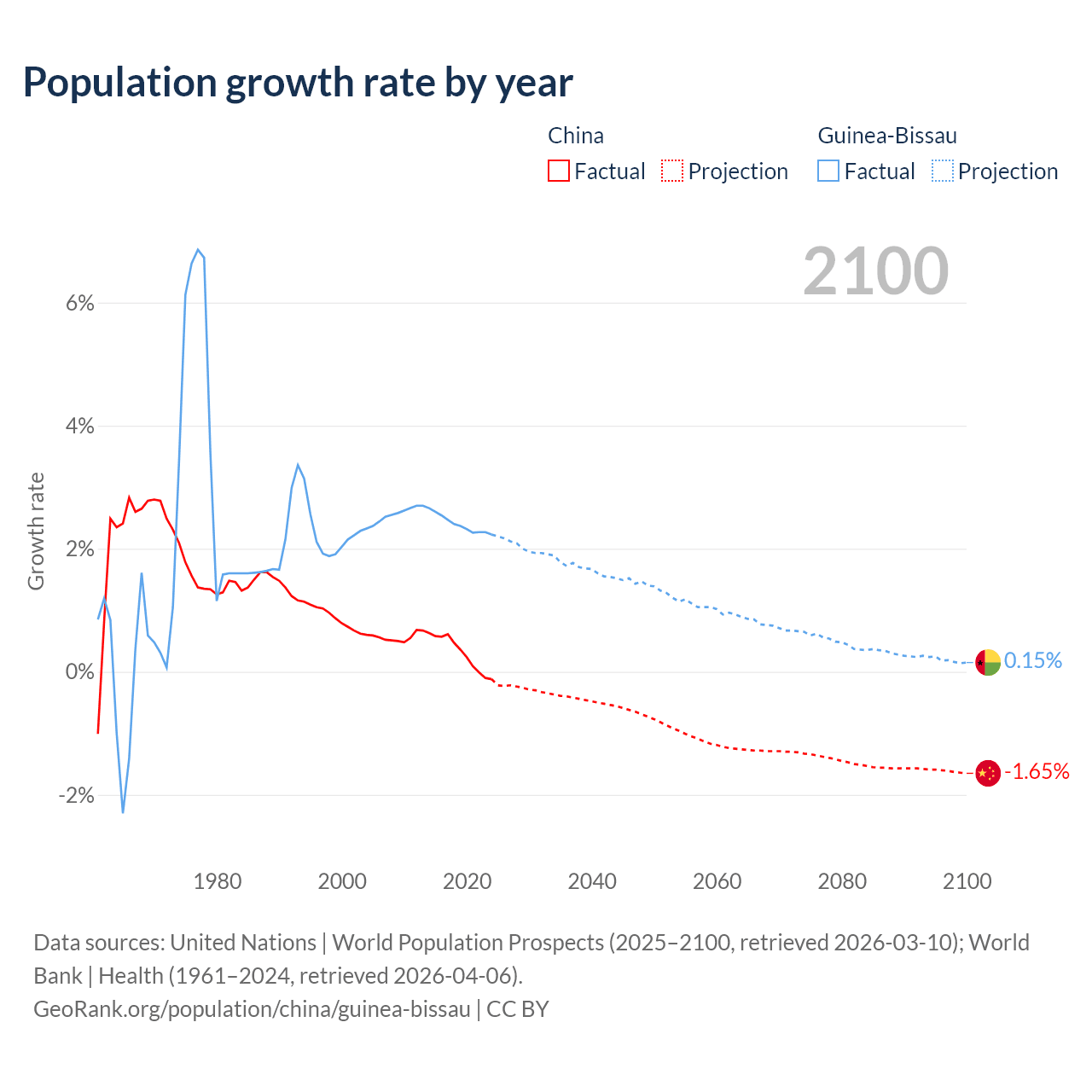 - For the last 10 years, China has had an average growth rate of +0.3% per year vs +2.4% in Guinea-Bissau.