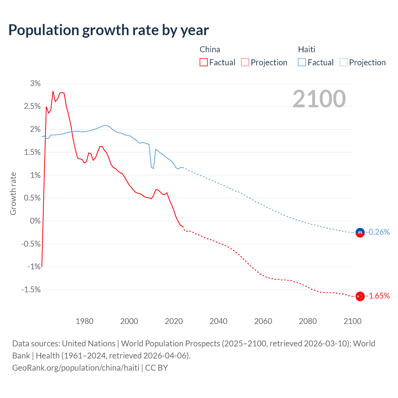 Data sources: World Bank | Health (1960–2024, retrieved 2026-04-06); United Nations | World Population Prospects (1960–2026, retrieved 2026-03-10); U.S. Census Bureau (1960–2025, retrieved 2026-02-08); Central Intelligence Agency (CIA) (2000–2019, retrieved 2026-02-20).