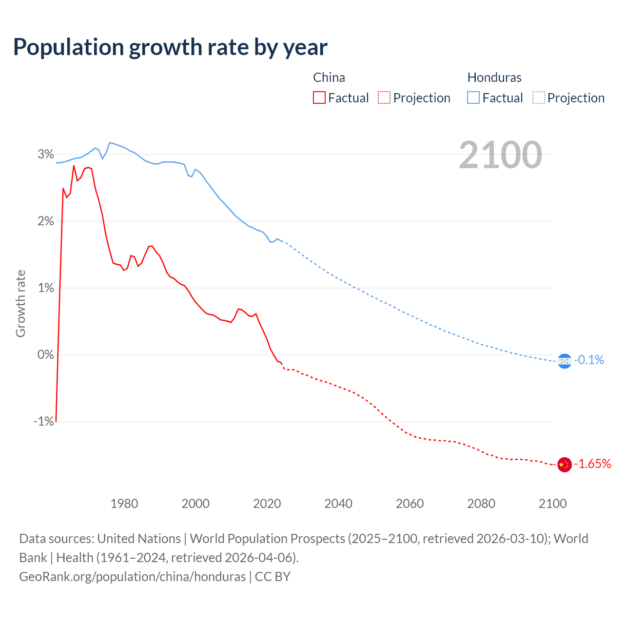 - For the last 10 years, China has had an average growth rate of +0.3% per year vs +1.81% in Honduras.