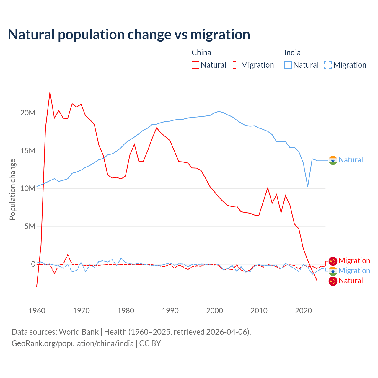 Over the last 10 years, 92.5% of the population change in China is from natural causes (a gain of 42,414,528 people) and 7.53% is from migration (a loss of 3,452,923 people). In India 96.4% is from natural causes (a gain of 145,503,378 people) and 3.56% is from migration (a loss of 5,376,884 people).