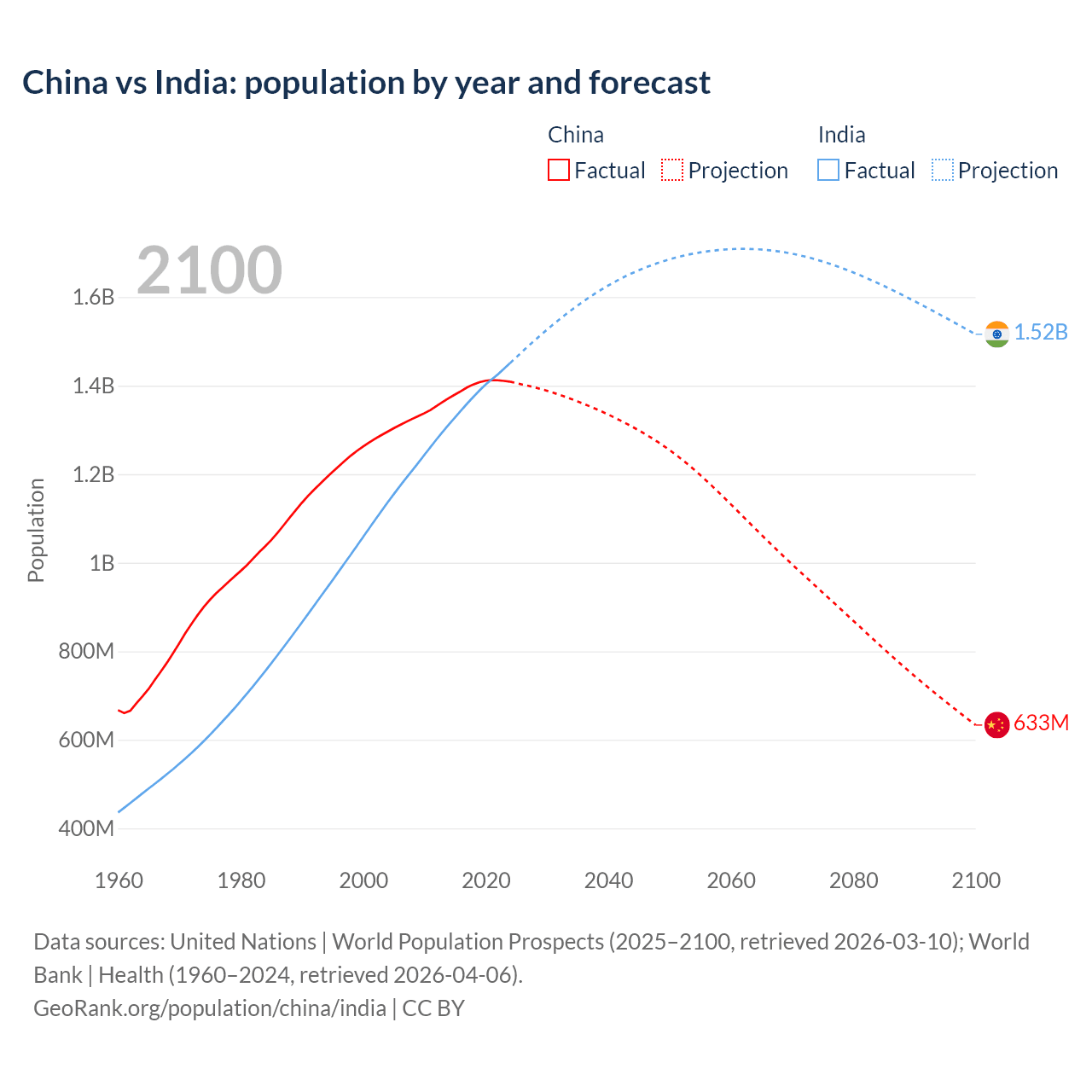 Data sources: World Bank | Health (1960–2024, retrieved 2026-04-06); United Nations | World Population Prospects (1960–2026, retrieved 2026-03-10); U.S. Census Bureau (1960–2025, retrieved 2026-02-08); Central Intelligence Agency (CIA) (2000–2019, retrieved 2026-02-20).