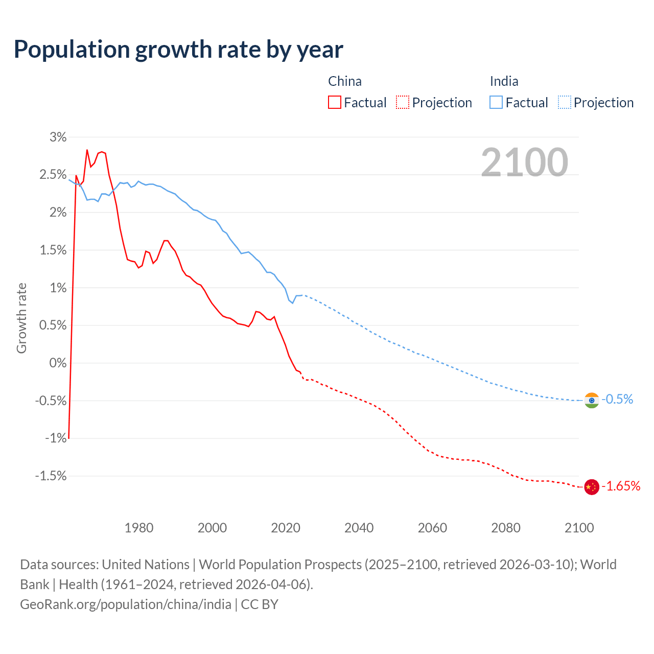 - For the last 10 years, China has had an average growth rate of +0.3% per year vs +1.03% in India.