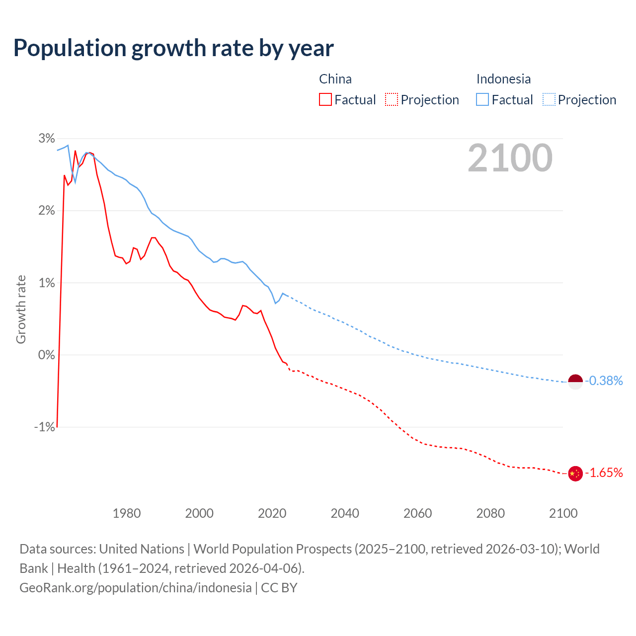 Data sources: World Bank | Health (1960–2024, retrieved 2026-04-06); United Nations | World Population Prospects (1960–2026, retrieved 2026-03-10); U.S. Census Bureau (1960–2025, retrieved 2026-02-08); Central Intelligence Agency (CIA) (2000–2019, retrieved 2026-02-20).
