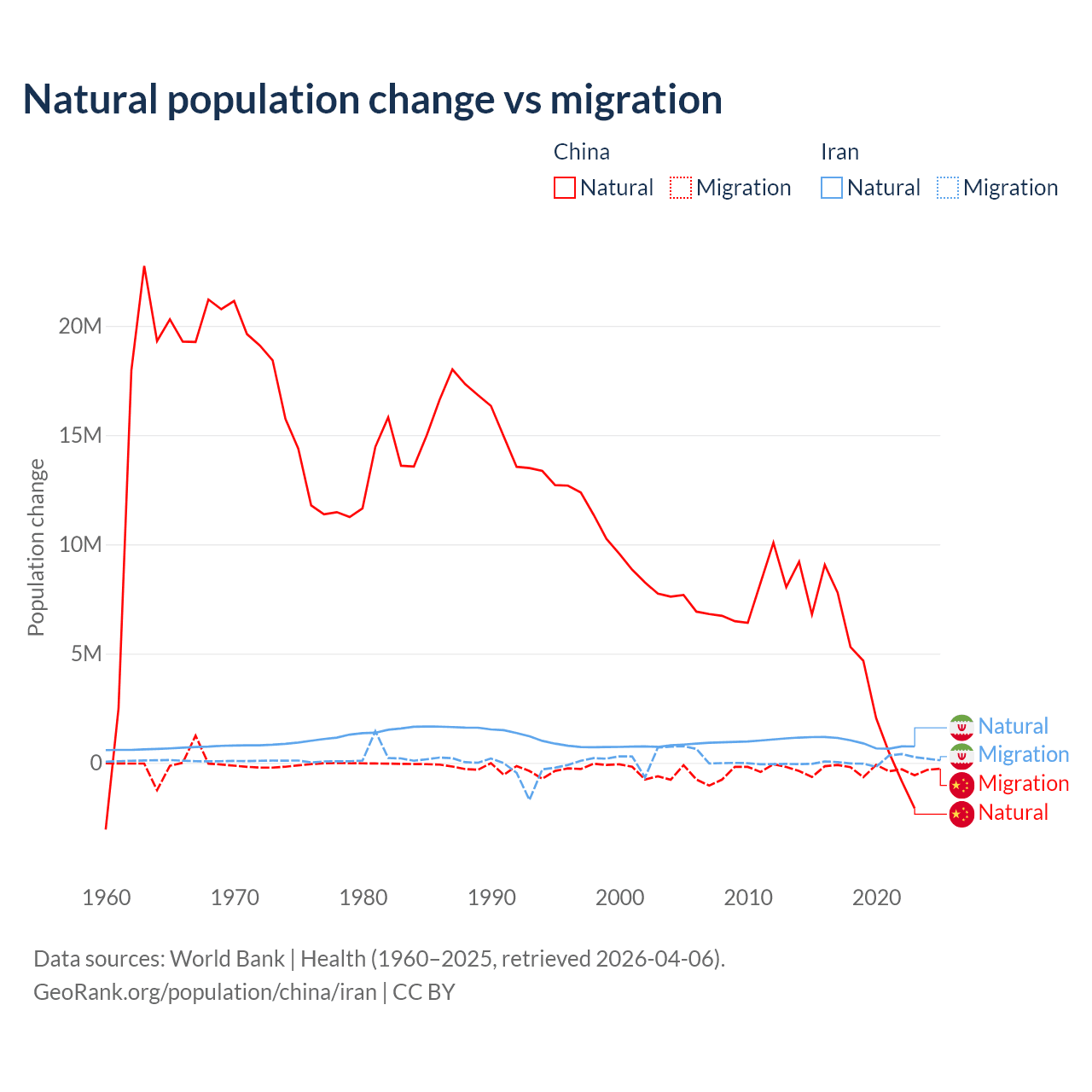 Over the last 10 years, 92.5% of the population change in China is from natural causes (a gain of 42,414,528 people) and 7.53% is from migration (a loss of 3,452,923 people). In Iran 92.5% is from natural causes (a gain of 9,405,860 people) and 7.46% is from migration (a gain of 757,979 people).