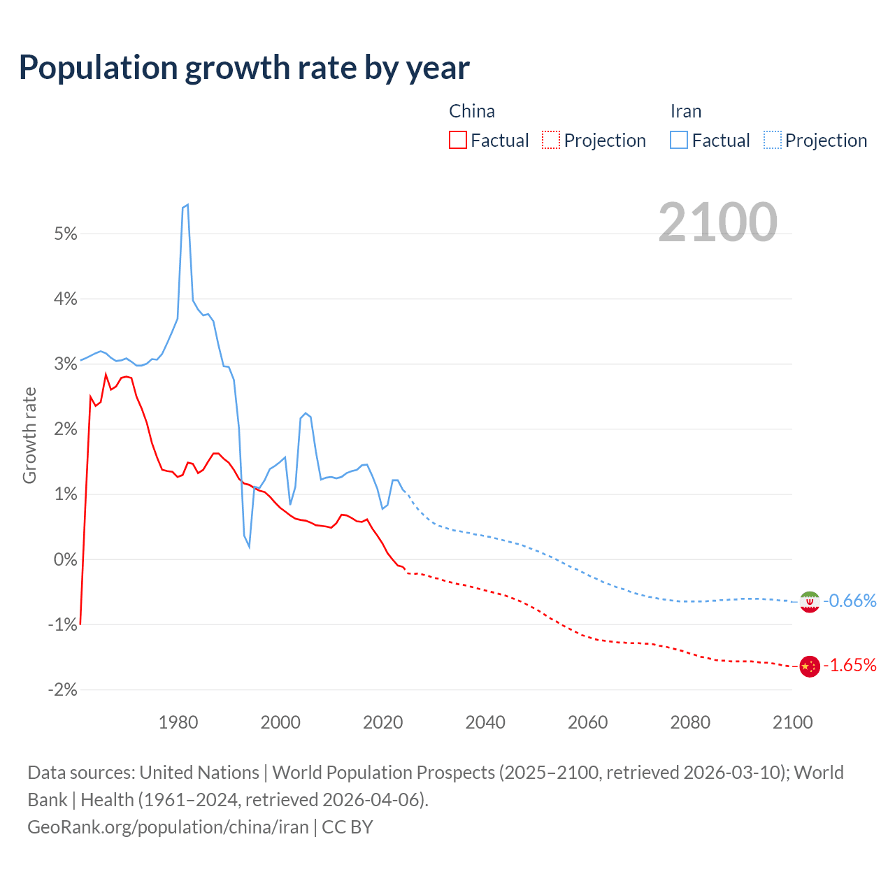 - For the last 10 years, China has had an average growth rate of +0.3% per year vs +1.19% in Iran.