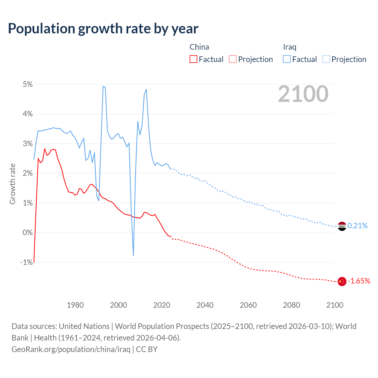 - For the last 10 years, China has had an average growth rate of +0.3% per year vs +2.45% in Iraq.