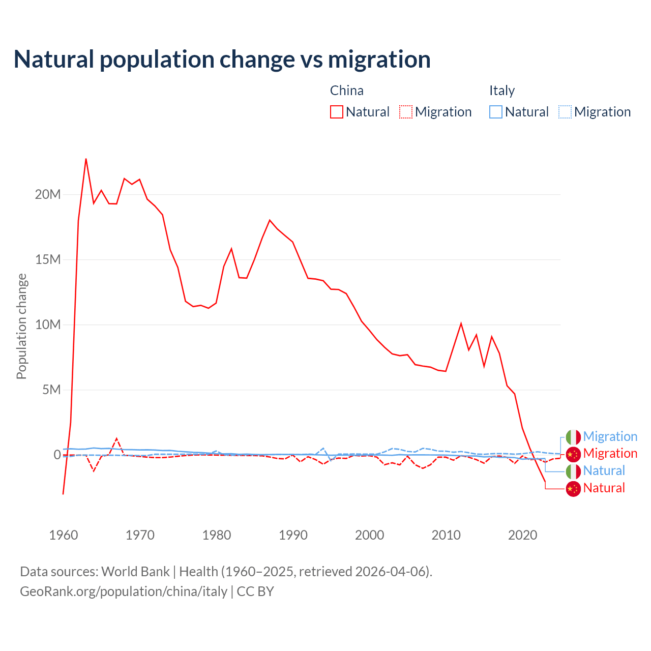 Over the last 10 years, 92.5% of the population change in China is from natural causes (a gain of 42,414,528 people) and 7.53% is from migration (a loss of 3,452,923 people). In Italy 68.6% is from natural causes (a loss of 2,239,084 people) and 31.4% is from migration (a gain of 1,026,128 people).