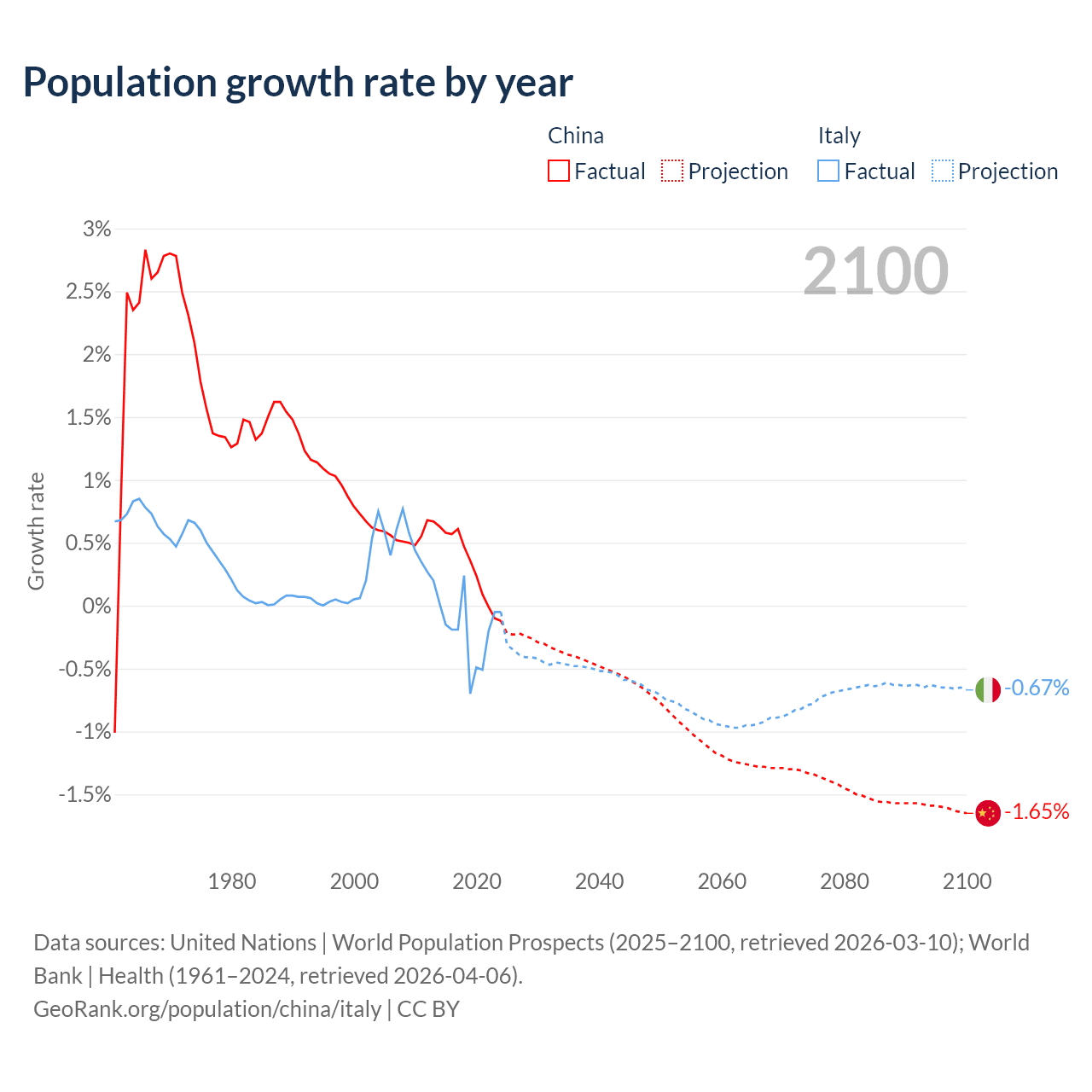 - For the last 10 years, China has had an average growth rate of +0.3% per year vs -0.21% in Italy.