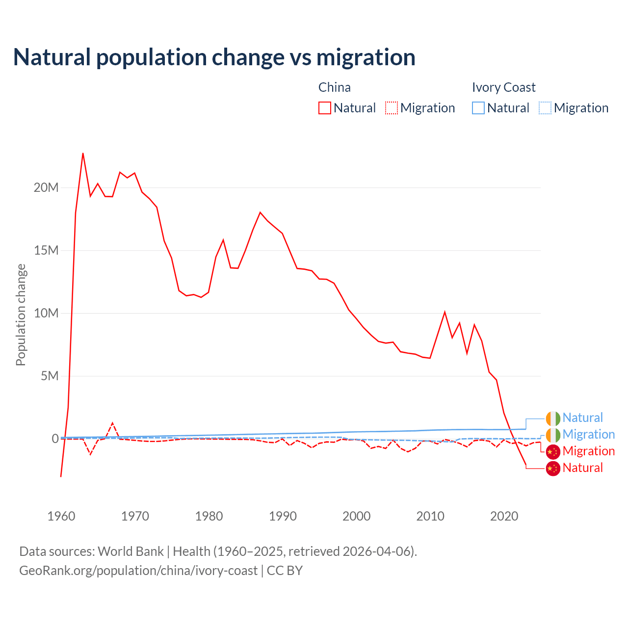 Over the last 10 years, 92.5% of the population change in China is from natural causes (a gain of 42,414,528 people) and 7.53% is from migration (a loss of 3,452,923 people). In Ivory Coast 99.7% is from natural causes (a gain of 7,348,944 people) and 0.33% is from migration (a gain of 24,432 people).