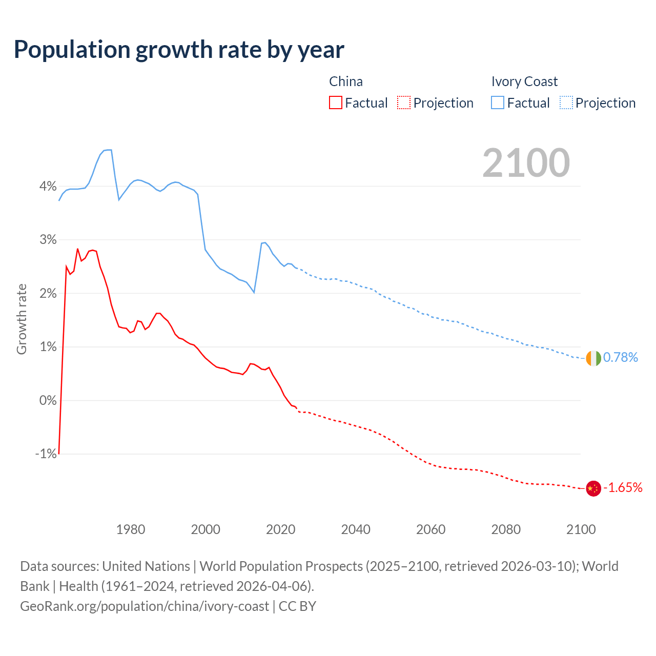 - For the last 10 years, China has had an average growth rate of +0.3% per year vs +2.65% in Ivory Coast.