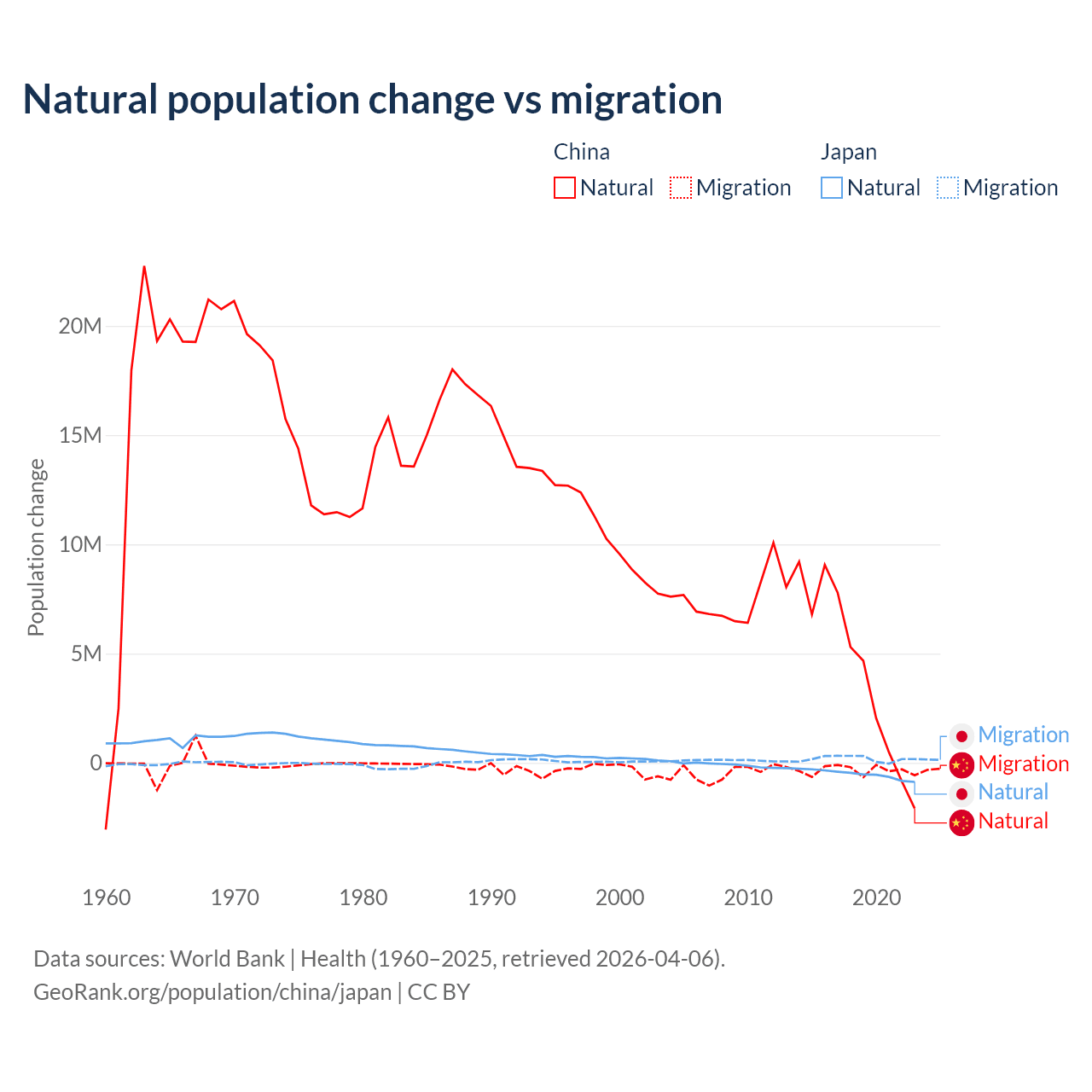 Over the last 10 years, 92.5% of the population change in China is from natural causes (a gain of 42,414,528 people) and 7.53% is from migration (a loss of 3,452,923 people). In Japan 73.6% is from natural causes (a loss of 5,178,838 people) and 26.4% is from migration (a gain of 1,860,103 people).