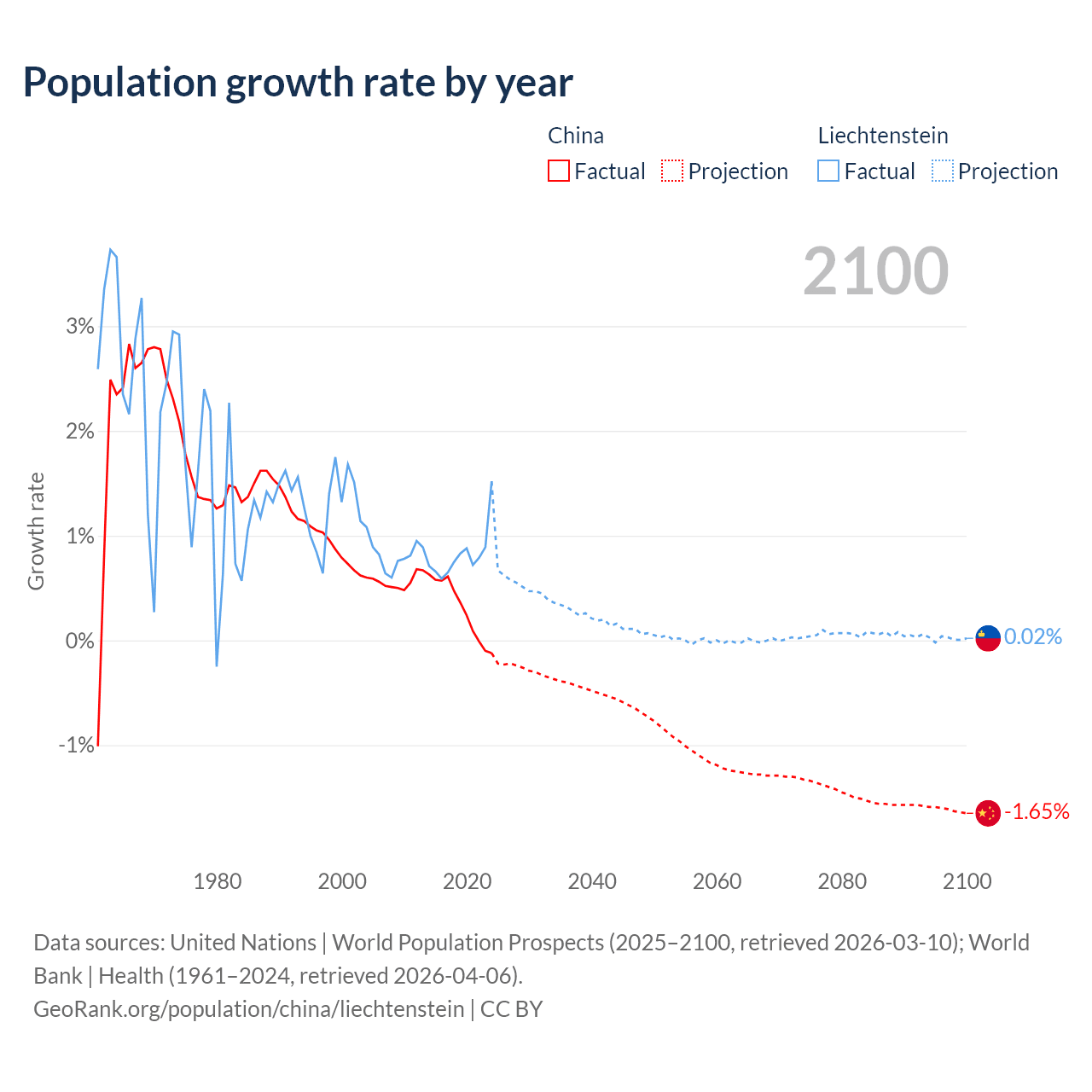 - For the last 10 years, China has had an average growth rate of +0.3% per year vs +0.82% in Liechtenstein.