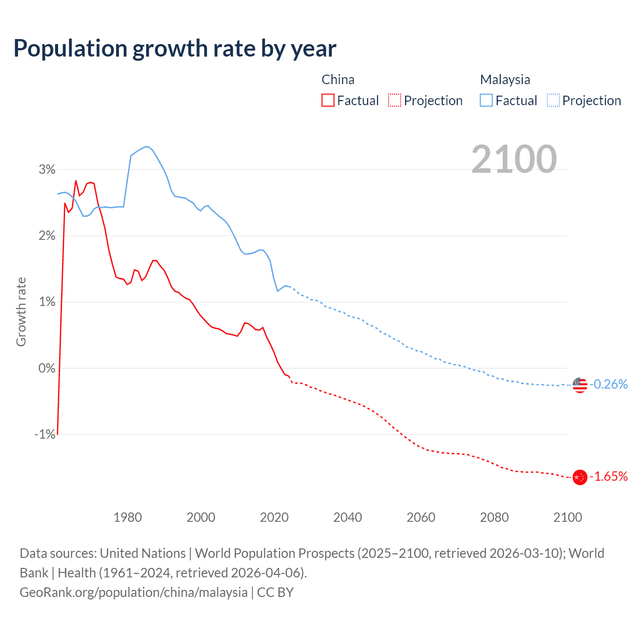 - For the last 10 years, China has had an average growth rate of +0.3% per year vs +1.5% in Malaysia.