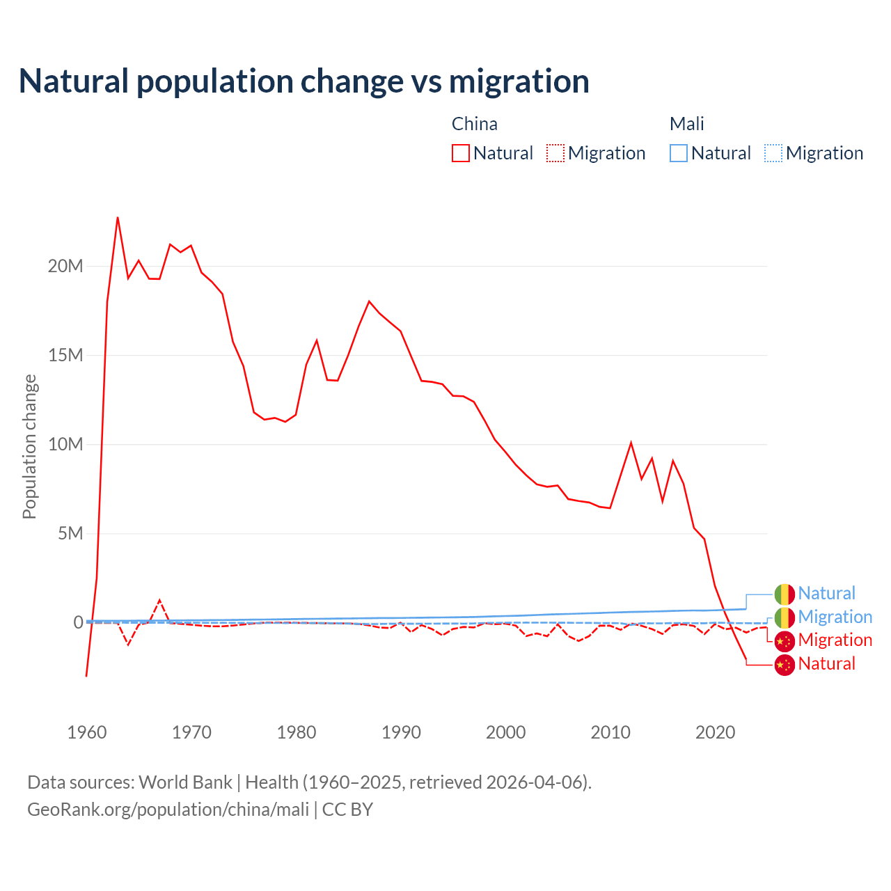 Over the last 10 years, 92.5% of the population change in China is from natural causes (a gain of 42,414,528 people) and 7.53% is from migration (a loss of 3,452,923 people). In Mali 94.9% is from natural causes (a gain of 6,749,473 people) and 5.13% is from migration (a loss of 365,292 people).