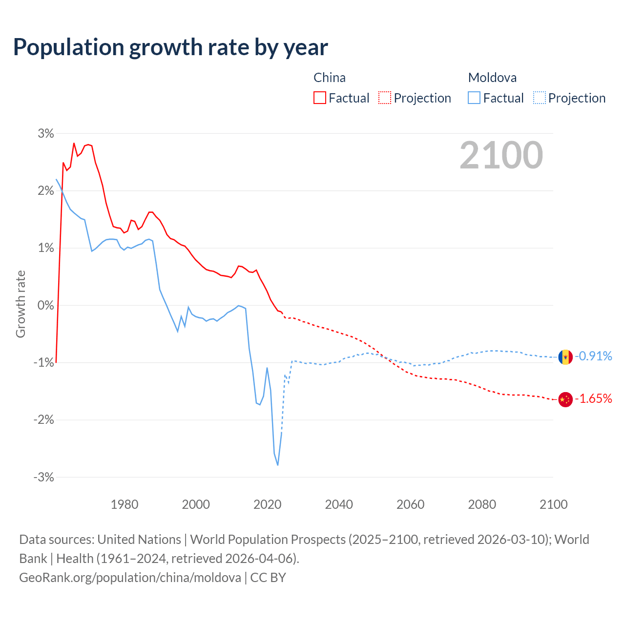 - For the last 10 years, China has had an average growth rate of +0.3% per year vs -1.57% in Moldova.