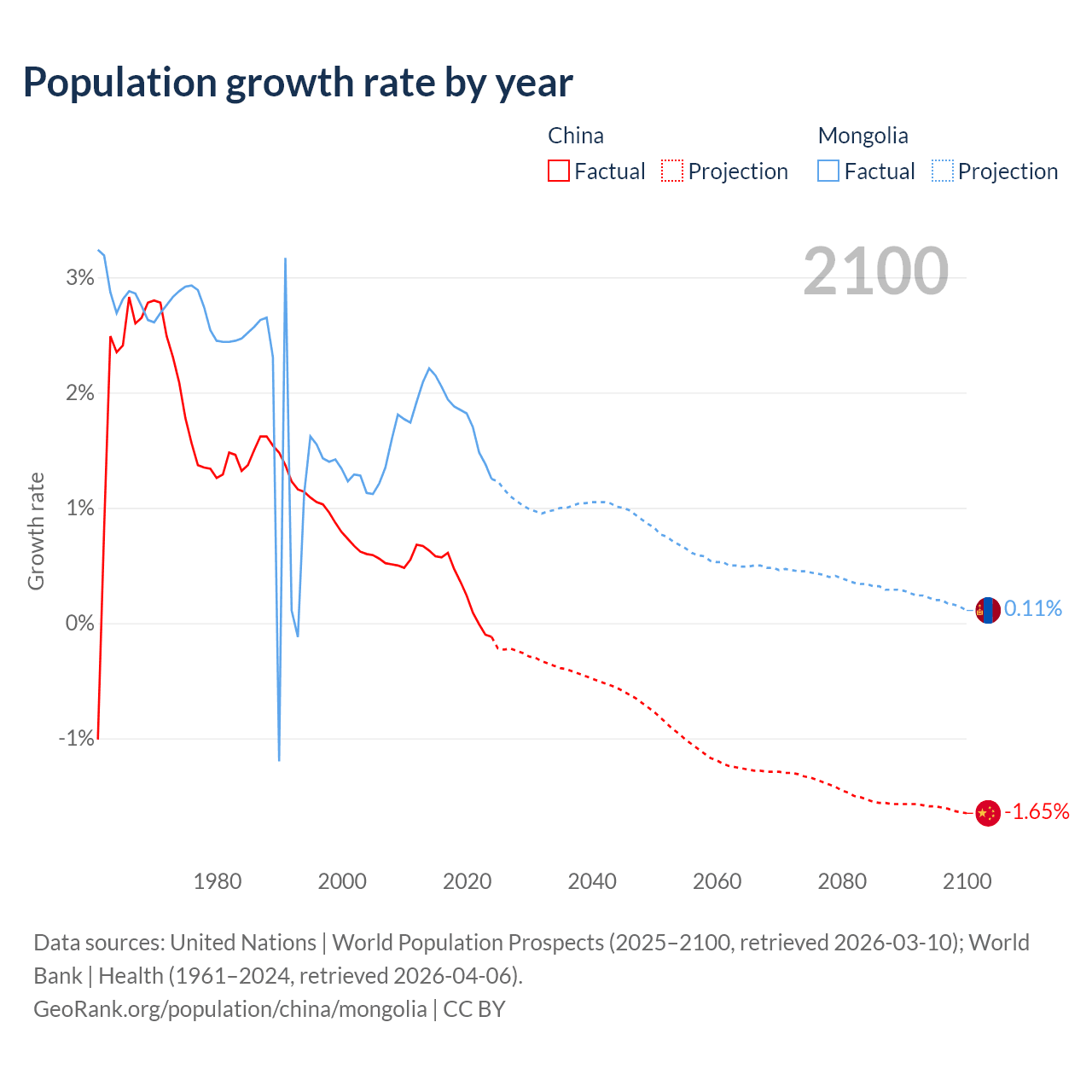 - For the last 10 years, China has had an average growth rate of +0.3% per year vs +1.79% in Mongolia.