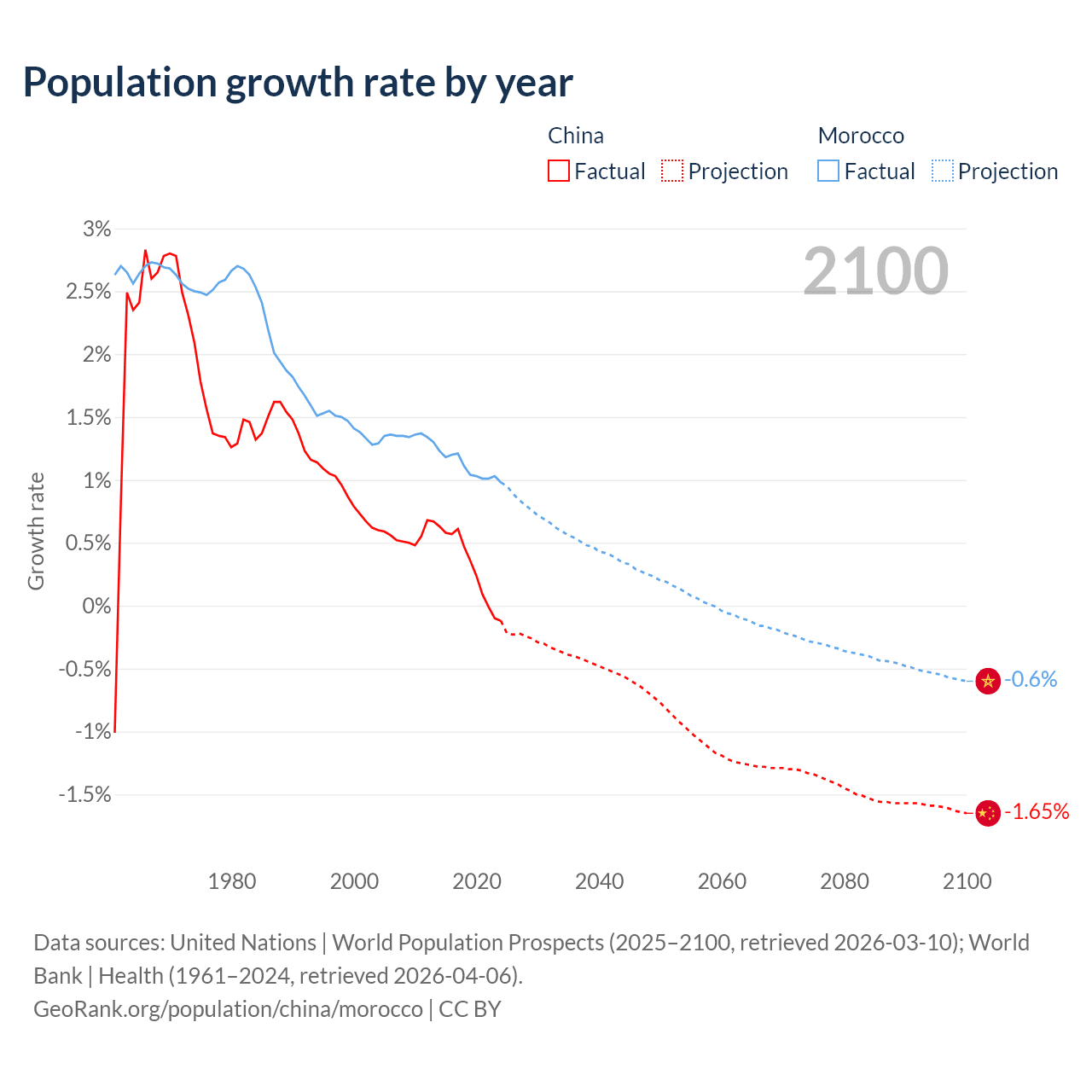 - For the last 10 years, China has had an average growth rate of +0.3% per year vs +1.09% in Morocco.