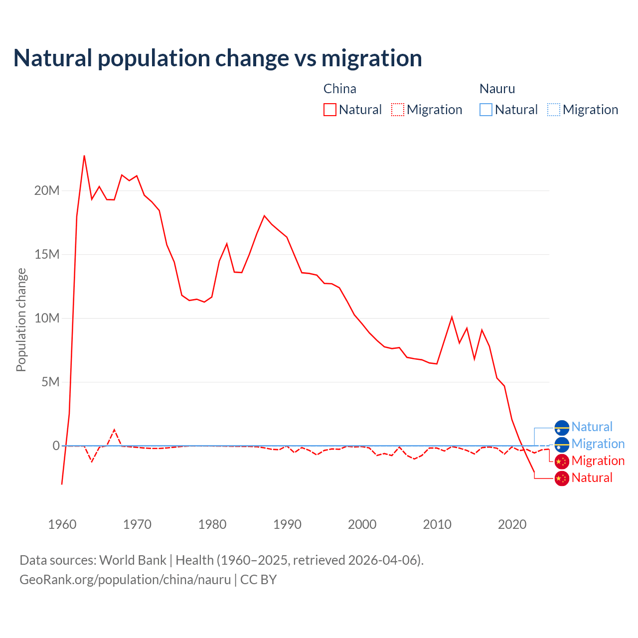 Over the last 10 years, 92.5% of the population change in China is from natural causes (a gain of 42,414,528 people) and 7.53% is from migration (a loss of 3,452,923 people). In Nauru 66.2% is from natural causes (a gain of 2,590 people) and 33.8% is from migration (a loss of 1,320 people).